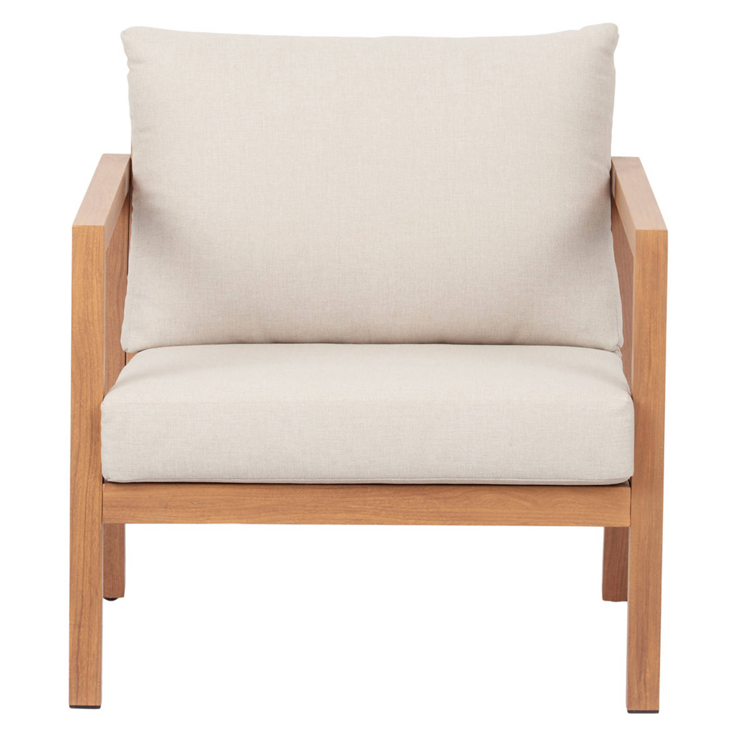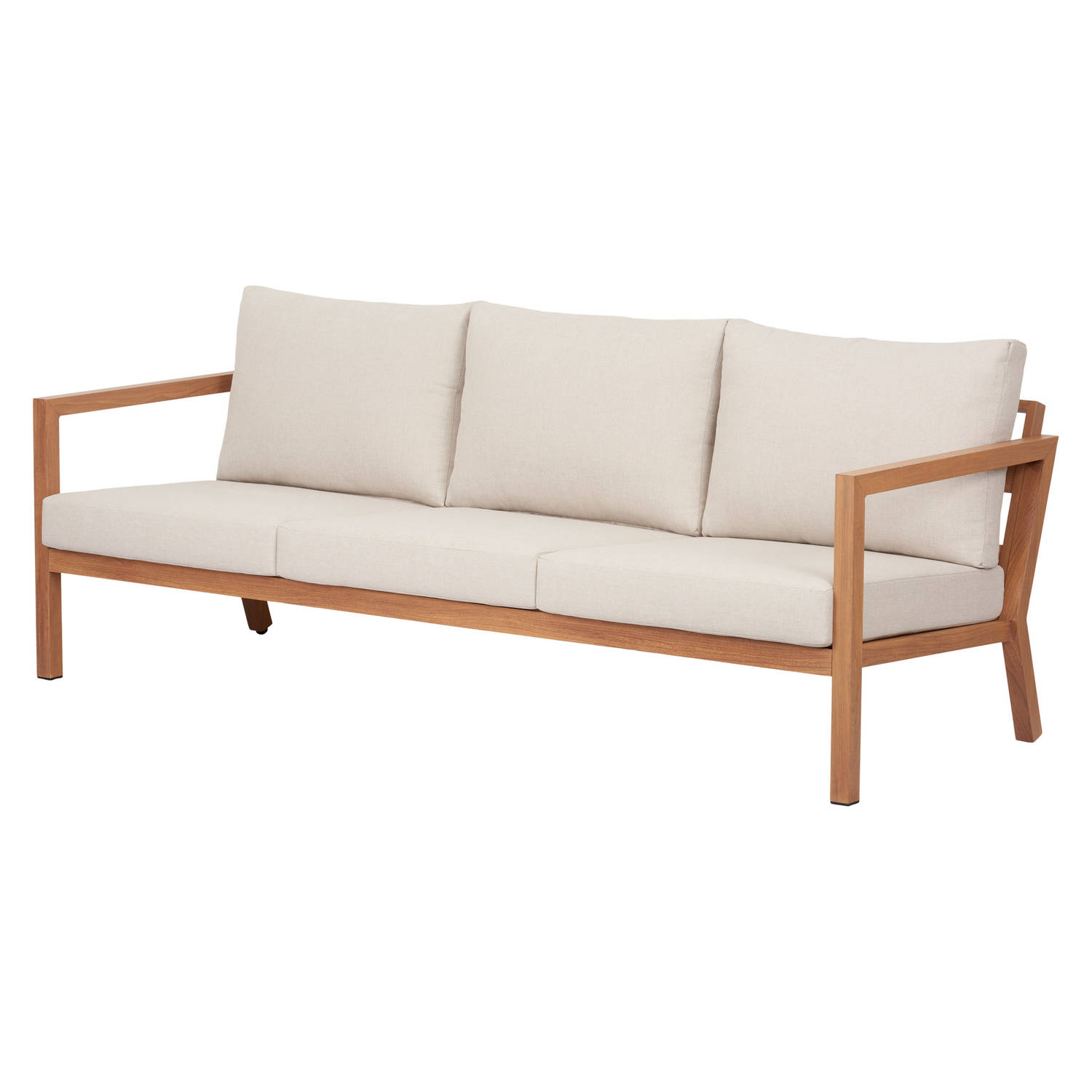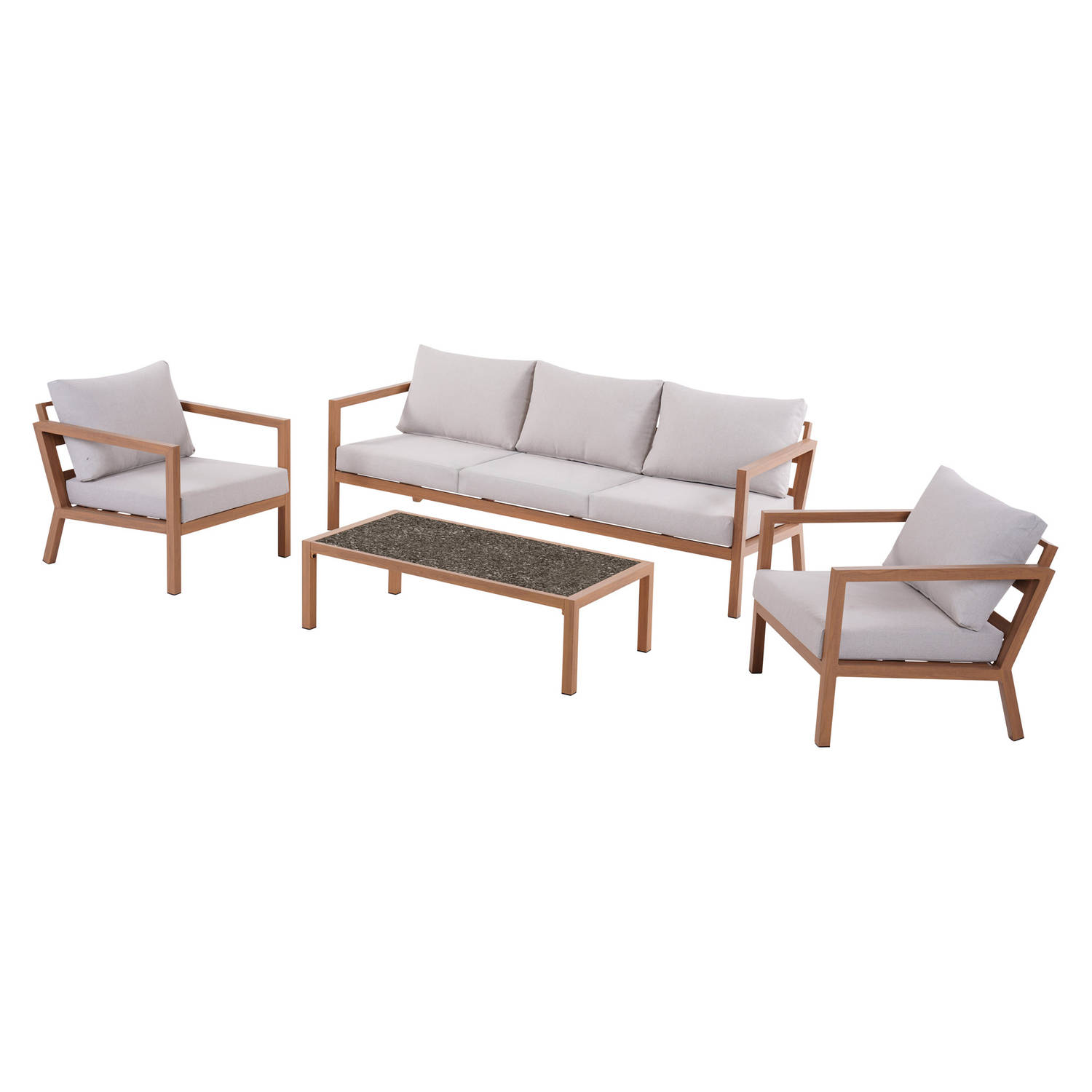 Stiilse ja kauni disainiga kvaliteetne aiamööblikomplekt Katinka. Kui teile meeldib naturaalse puidu tooni aiamööbel, kuid te taha puidu eest puitu aastast aastasse hooldada, siis see komplekt on just teile. Raamid on naturaalses toonis pulbervärvitud alumiiniumist, lauaplaat hallist pritskivist ja padjad valgest polüestrist. Komplekt koosneb diivanist, kahest toolist, lauast ja patjadest.