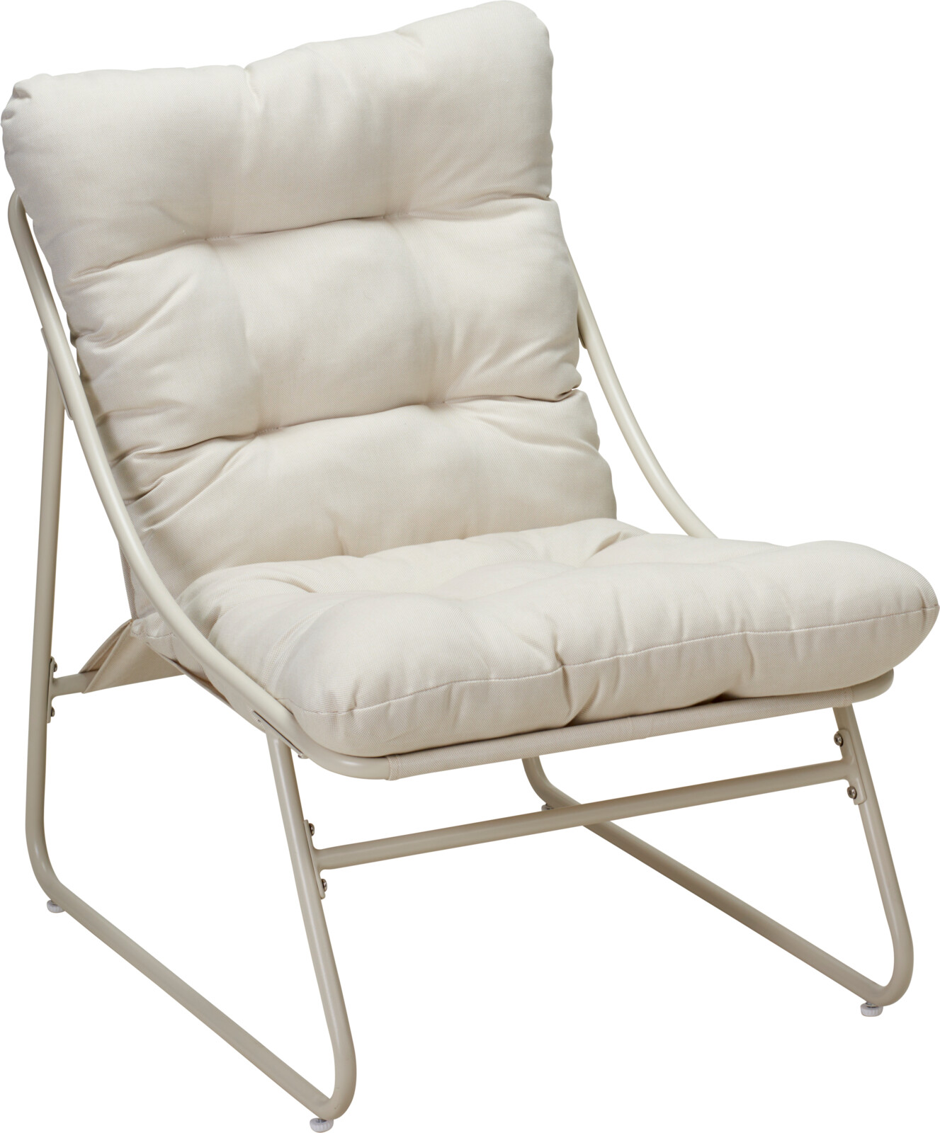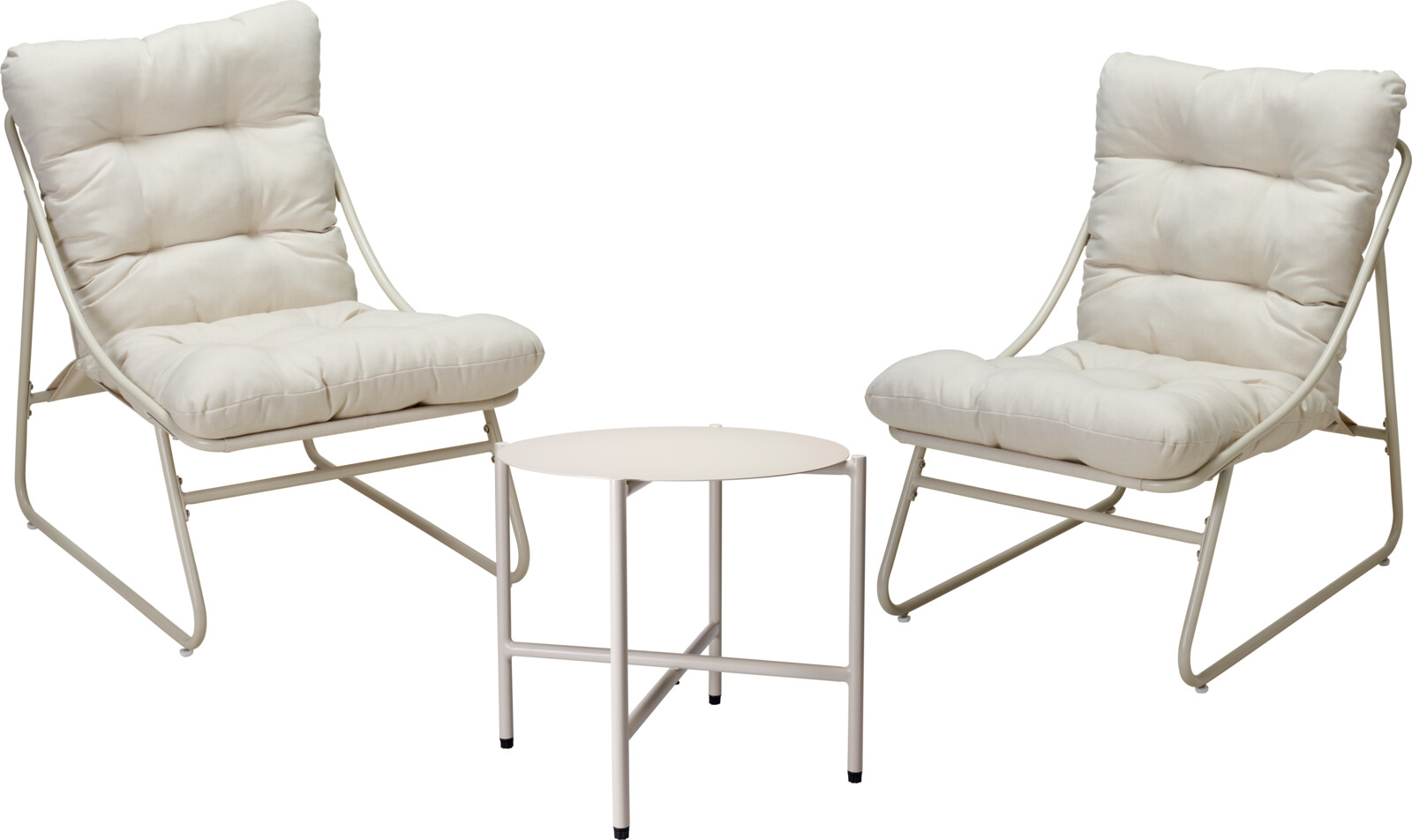 Kolmeosaline aiamööblikomplekt on ideaalne valik väiksematele terrassidele ja rõdudele. Komplekt koosneb kahest tooli ja ühest ümmargusest kohvilauast. Kreemjas värvitoon loob rahuliku ja soojade toonidega õhkkonna. Terasraamistik pulbervärviga viimistlusega tagab vastupidavuse ja ilmastikukindluse. Toolide pehmed istmepadjad kreemja polüesterkangas on mugavad ja praktilised.