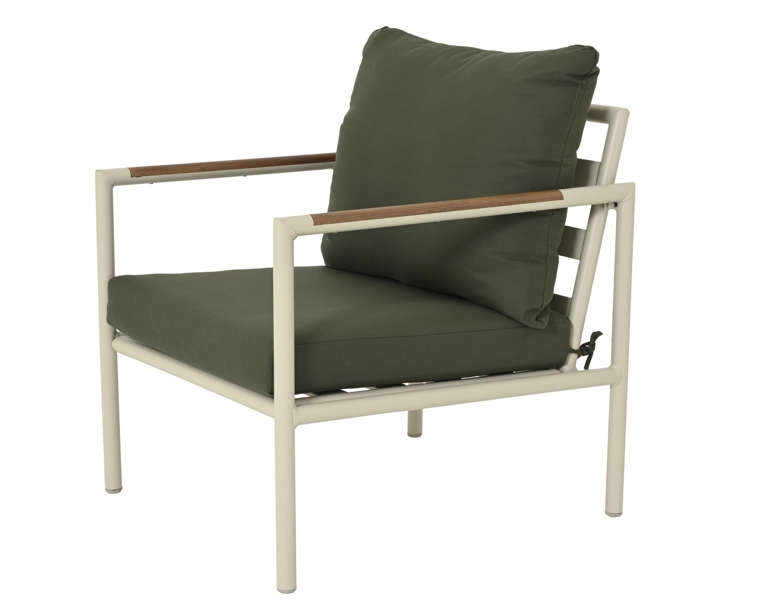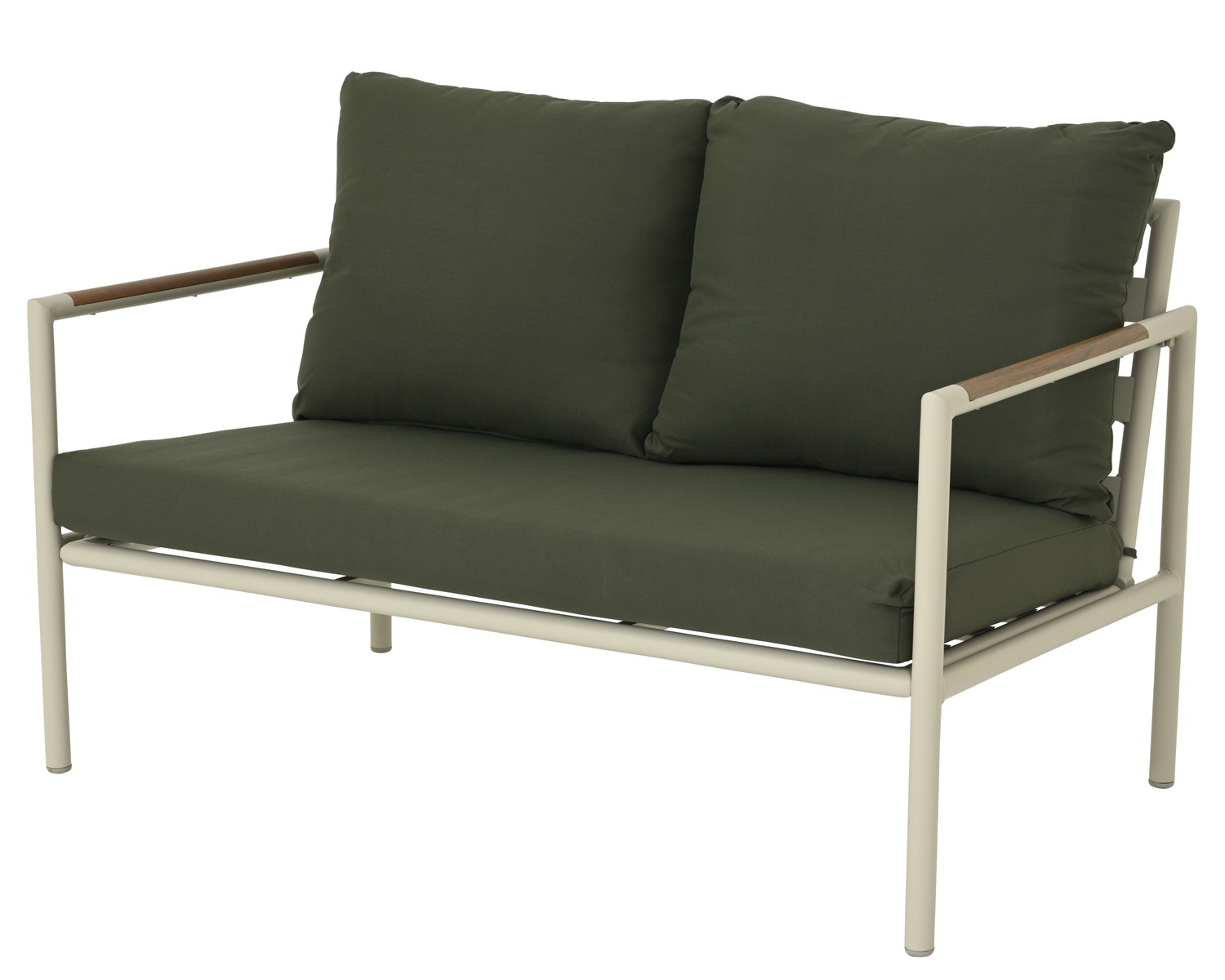 Espera aiamööblikomplekt loob terrassile või aeda kaasaegse ja hubase istumisala. Komplekt koosneb kahekohalise diivani, kahe tugitoolist ja ühest kohvilauas. Alumiiniumraam beež värvitooniga ja puiduimitatsiooniga käetugedel loovad sooja ja loodusliku välimuse. Tumehallikas-rohelised istmepadjad olefiin-kangaga on veekindlad ja vastupidavad, sobides hästi õuekeskkonda.