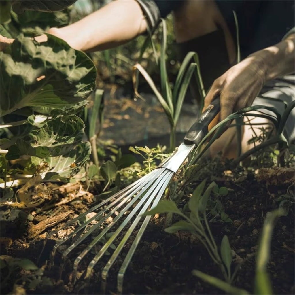 Fiskars Xact lehvikukujuline väike aiareha on ideaalne tööriist lehtede, umbrohu ja murulõikmete eemaldamiseks väikestest peenardest ning raskesti ligipääsetavatest kohtadest. Täpselt vormitud roostevabast terasest rehapäis seitsme piiga abil tagab suurepärase täpsuse ja kontrolli. Ergonoomiline SoftGrip™ käepide võimaldab mitut haardeasendit, samas kui pikem vars pakub täiuslikku tasakaalu ja lisajõudu vajaduse korral.