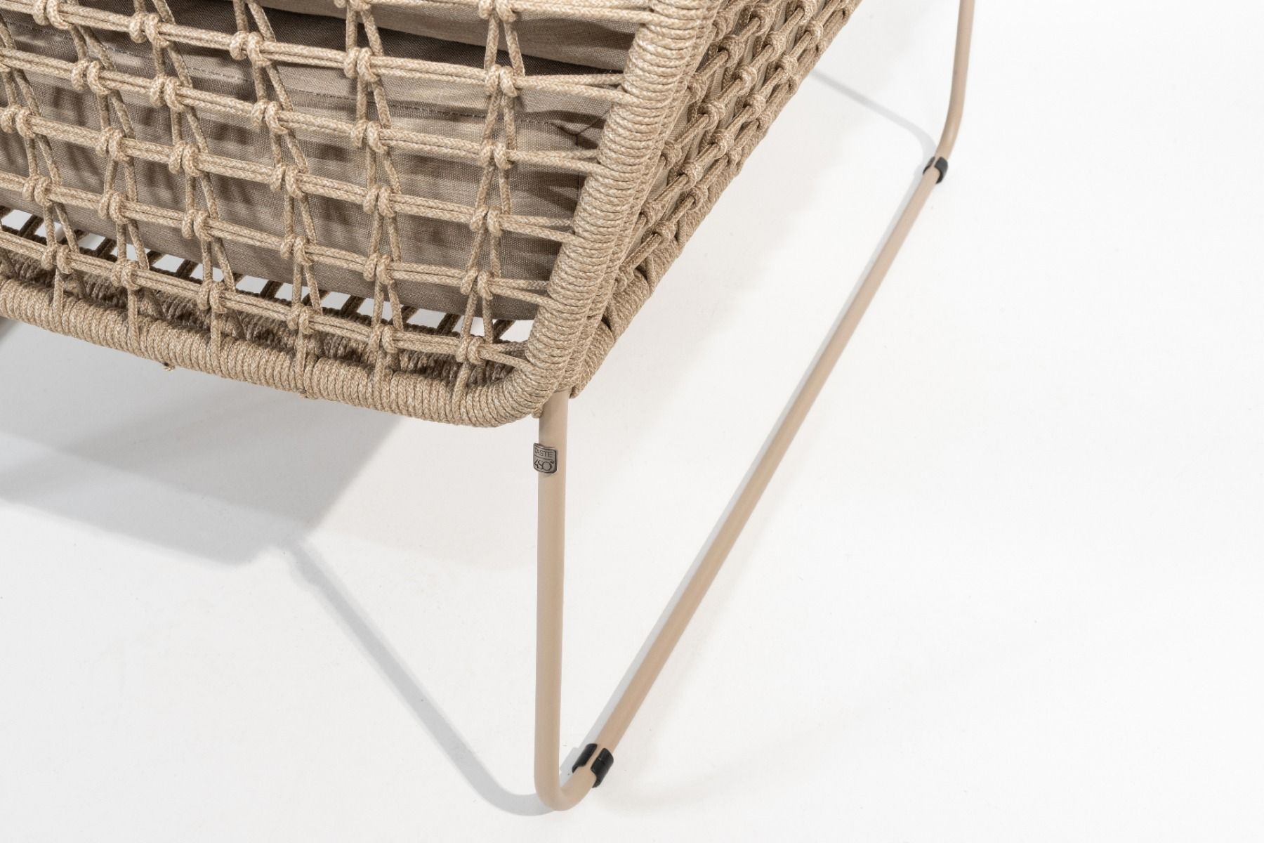 Albano aiatool pakub elegantset kombinatsiooni vastupidavusest ja mugavusest. Selle tugev raam on valmistatud kreemivärvi roostevabast terasest, mida täiendab käsitsi põimitud liivatooni köis. Vastupidavad materjalid teevad sellest toolist usaldusväärse valiku nii sise- kui ka välistingimustesse – UV-kindel köis ei tuhmu aja jooksul ning raam peab vastu ka muutlikele ilmastikuoludele.
