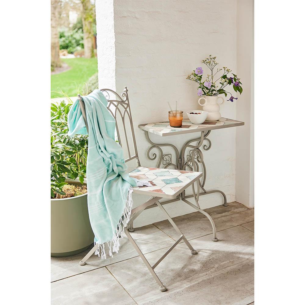 Stiilne Bistro aiatool lisab igale aiale, terrassile või rõdule elegantse ja kaasaegse ilme. Kvaliteetsetest materjalidest ja ainulaadsest disainist valmistatud tool paistab silma oma istmega, millel on kaunis mosaiik. Sobib suurepäraselt kohvijoomiseks väljas või täiendama mööblikomplekti väikesel terrassil.