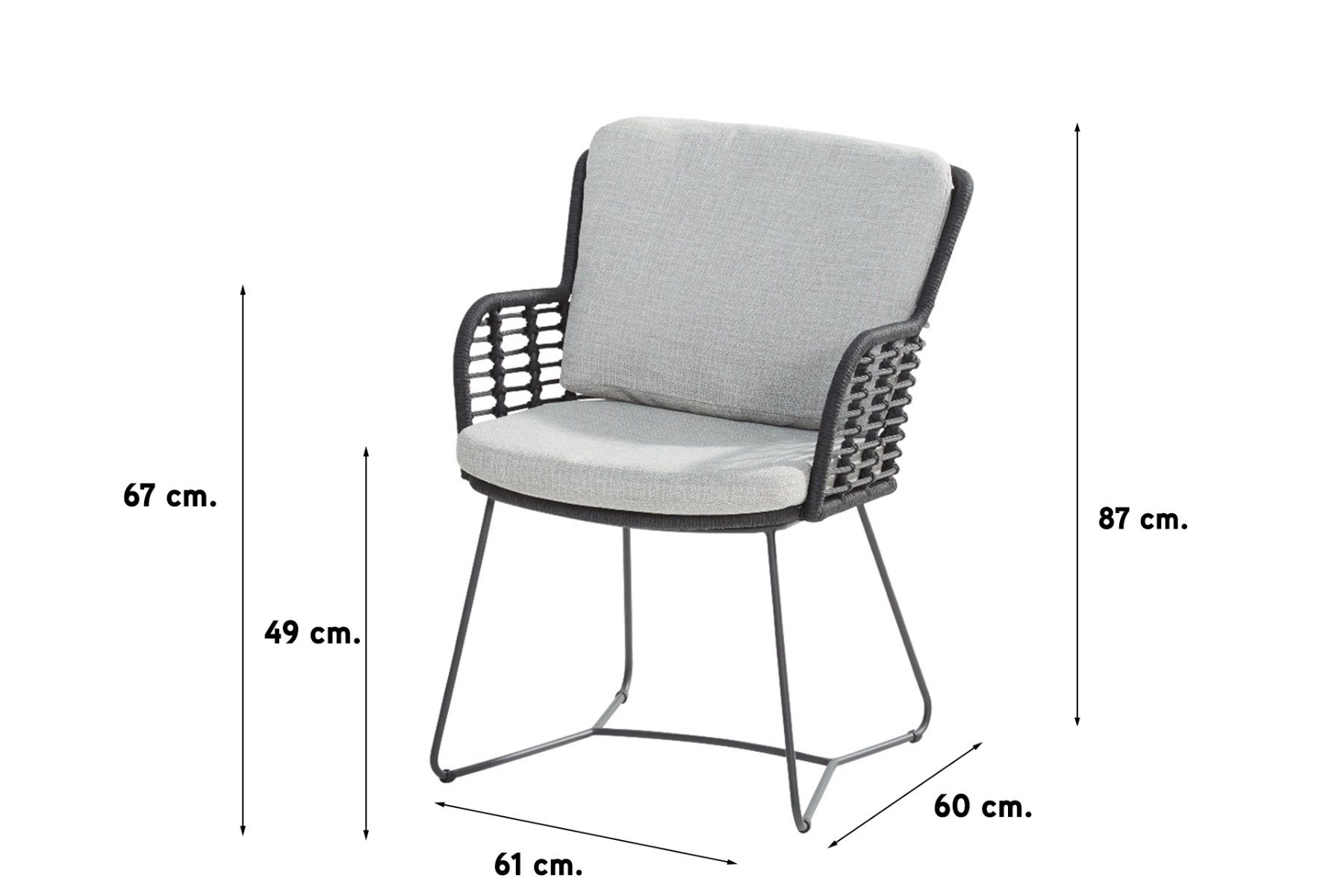 Tehniline info Materjalid: roostevaba teras, köis Mõeldud sise- ja välistingimustes kasutamiseks: jah Reguleeritavad jalad: ei Patjade arv: 2 Virnastatav: ei Kõrgus: 87cm Laius: 61cm Sügavus: 60cm Istme kõrgus: 49cm Käetoe kõrgus: 67cm Mõõteviga: ± 2cm