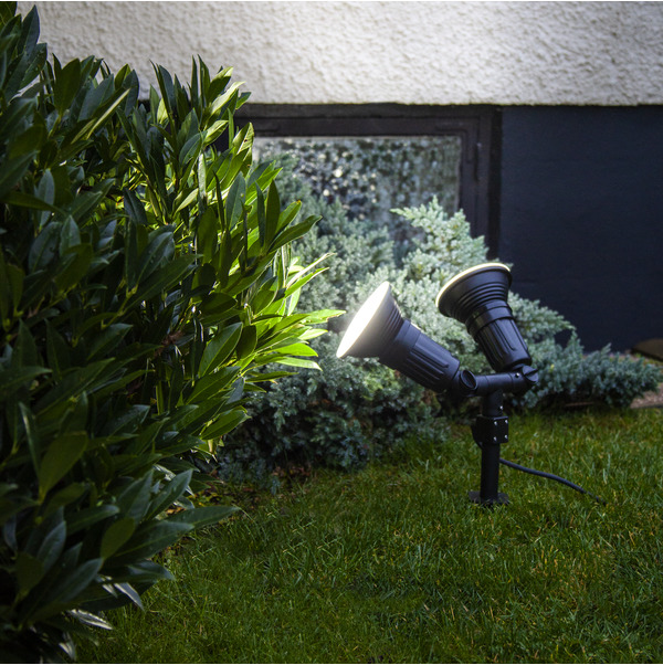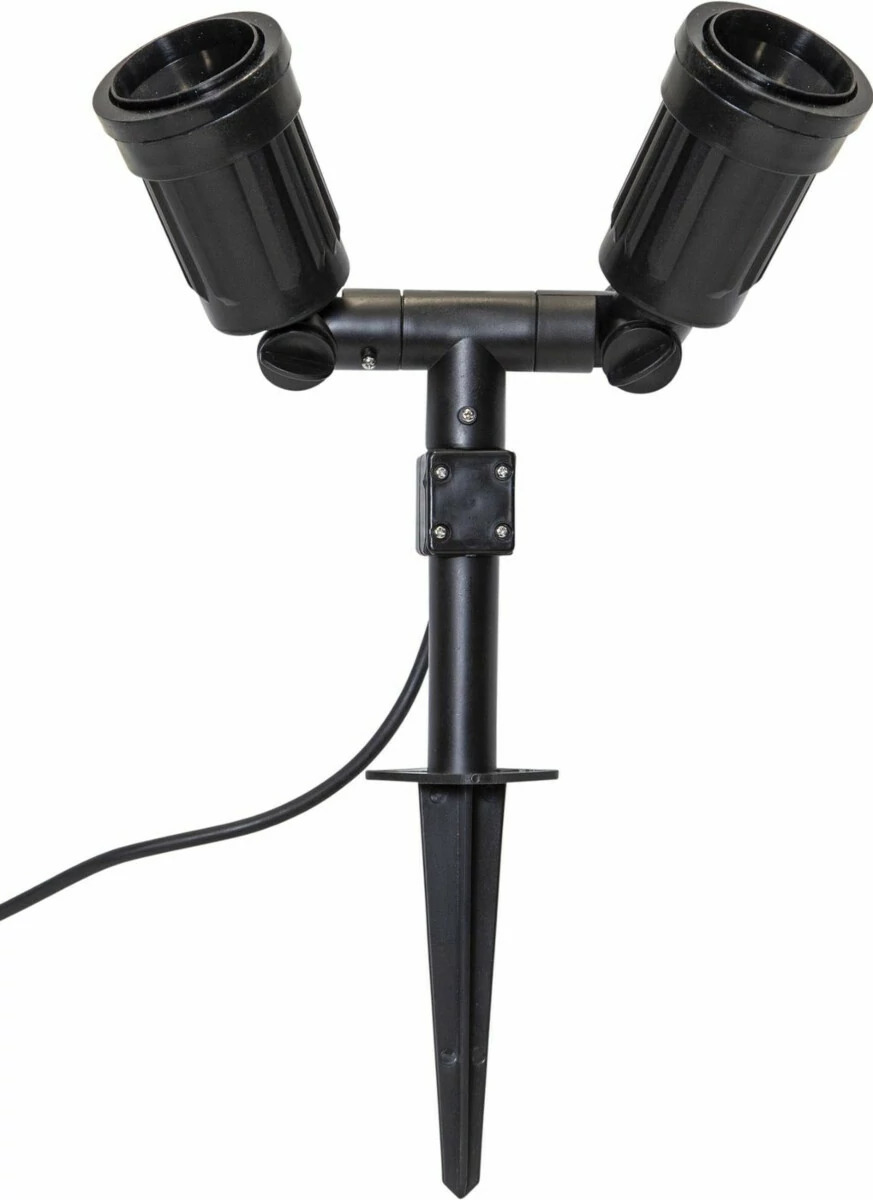 Outdoor Spotlight Fixture on vastupidav ja funktsionaalne kahe valguspesaga välisvalgusti, mis sobib ideaalselt puude, põõsaste või fassaadide valgustamiseks. Komplektis on maapiik mugavaks paigaldamiseks murule või peenrasse. Valgusti sobib E27 sokliga PAR38 tüüpi valgusallikatele (ei kuulu komplekti). 5 meetri pikkune kummikaabel võimaldab paindlikku paigutust ning IP44 kaitseklass tagab kasutuse ka välistingimustes.