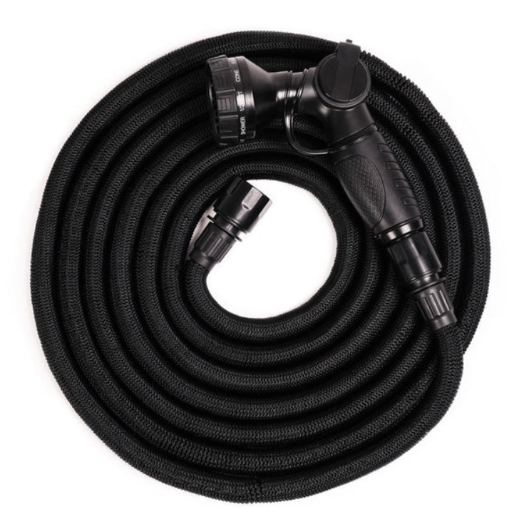 Komplekti Deluxe kuulub 15m must voolik, eksklusiivne püstolpihusti 10 programmiga, matt vooliku nagi, sametkott.
