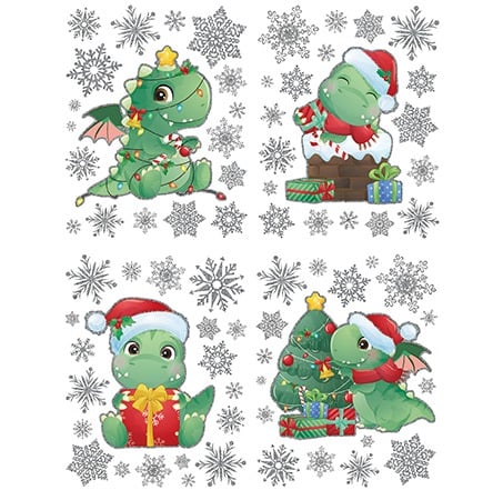 Lustakad dinosauruskleebised koos hõbedaste lumehelvestega loovad aknale mängulise talveilme. Sobivad suurepäraselt laste tuppa või rõõmsameelseks jõulukaunistuseks eluruumidesse. Kleepsud kinnituvad staatilise elektri abil liimita, püsivad kenasti klaasil ja on kergesti eemaldatavad ning taaskasutatavad.