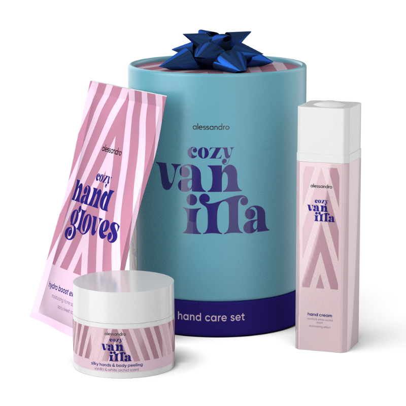 Alessandro Cozy Vanilla kätehoolduskomplekt on luksuslik ja hooldav kinkekomplekt, mis on loodud kuivade ja hoolitsust vajavate käte hellitamiseks. Sooja ja hubase vanilliaroomiga komplekt pakub täielikku hooldusrituaali – koorimisest kuni intensiivse niisutuseni. Tooted töötavad koos, et taastada naha pehmus, elastsus ja hoolitsetud välimus, pakkudes samal ajal mõnusat spaataolist elamust ka kodustes tingimustes.