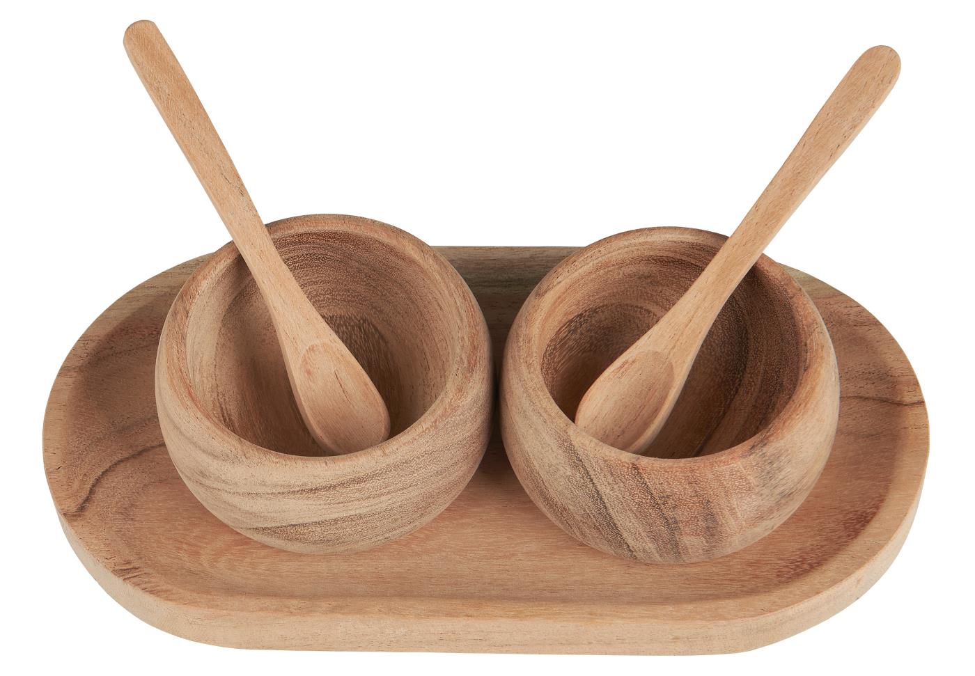 Akaatsiapuust alus kahe kausi ja lusikatega. Elegantne ja praktiline komplekt, mis koosneb naturaalsest akaatsiapuust alusest, kahest kausist ja kahest lusikast. Sobib ideaalselt serveerimiseks – olgu need siis snäkid, erinevad kastmed või vürtsid. Naturaalse akaatsiapuu soe toon ja unikaalne puidusüü annavad igale lauale kauni ja hubase ilme. Komplekt on vastupidav ja samas dekoratiivne, pakkudes nii igapäevast kasutusmugavust kui ka stiilset serveerimislahendust pidulikul laual.