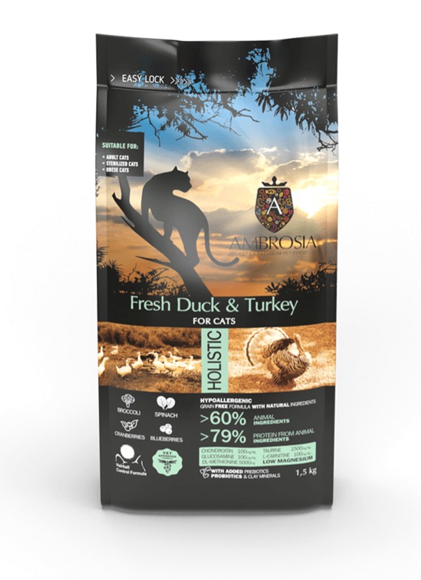 Ambrosia Teraviljavaba Täitoit Värske Pardi ja Kalkunilihaga täiskasvanud kassidele, kõik tõud.