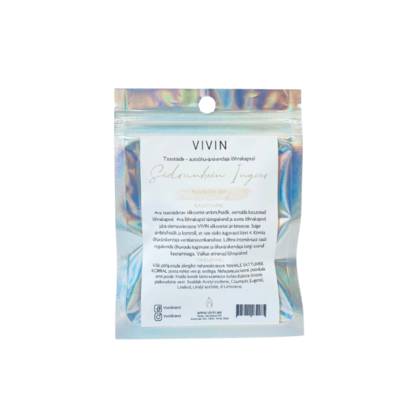 Ava taastäidetav silikoonist ümbris/hoidik, eemalda kasutatud lõhnakapsel. Ava lõhnakapsli täitepakend ja aseta lõhnakapsel juba olemasolevasse VIVIN silikoonist ümbrisesse. Sulge ümbris/hoidik ja kontrolli, et see oleks tugevasti kinni 4. Kinnita õhuvärskendaja ventilatsioonikanalisse. Lõhna intensiivsust saab reguleerida õhuvoolu tugevuse ja õhuvärskendaja korgi asendi keeramisega. Valikus erinevad lõhnatäited.