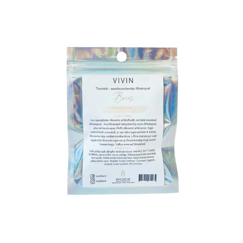 Ava taastäidetav silikoonist ümbris/hoidik, eemalda kasutatud lõhnakapsel. Ava lõhnakapsli täitepakend ja aseta lõhnakapsel juba olemasolevasse VIVIN silikoonist ümbrisesse. Sulge ümbris/hoidik ja kontrolli, et see oleks tugevasti kinni 4. Kinnita õhuvärskendaja ventilatsioonikanalisse. Lõhna intensiivsust saab reguleerida õhuvoolu tugevuse ja õhuvärskendaja korgi asendi keeramisega. Valikus erinevad lõhnatäited.