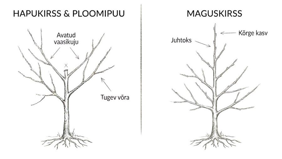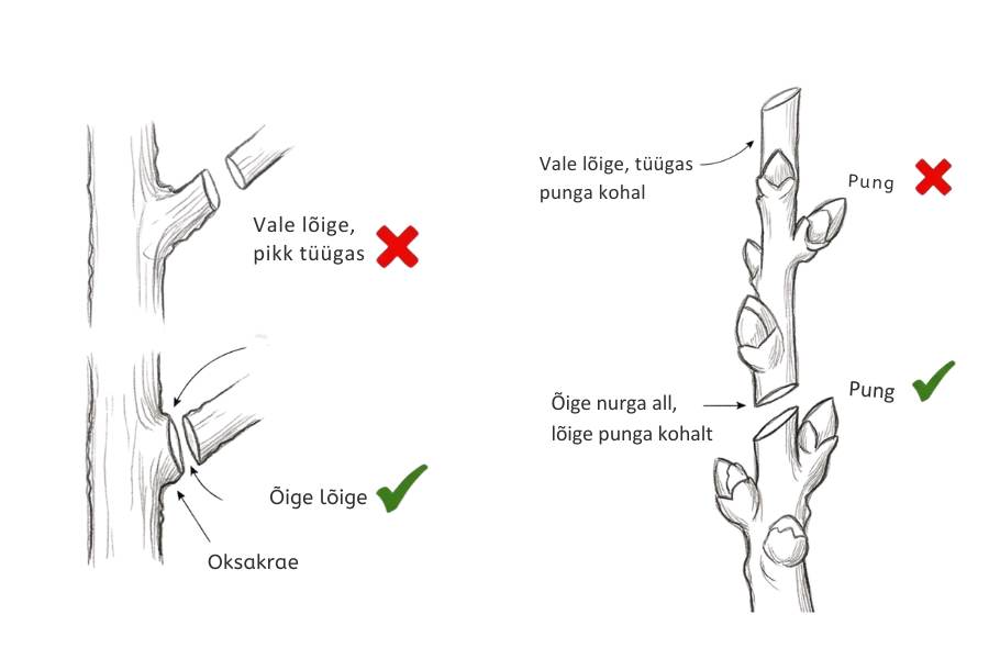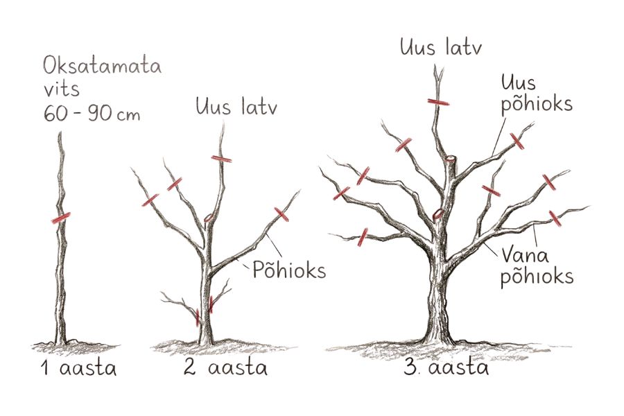 Blogi peamine osa Kevadine viljapuude lõikamine: kuidas kujundada noori, kandeeas ja vanu puid Viljapuud Viljapuude lõikamine tekitab paljudes algajates aednikutes hirmu. Mis siis, kui lõikan midagi valesti? See mure on arusaadav, kuid tegelikult on lõikamata jätmine puule palju kahjulikum kui mõni ebatäpne lõige. Korrastamata võra jääb valguseta, haigused levivad ning viljad jäävad peeneks ja maitsetuks. Selles juhendis õpid: miks ja millal viljapuid lõigata; kuidas lõigata õuna- ja pirnipuid, kirsi- ja ploomipuid ning aprikoosi ja virsikut; kuidas päästa vana ja ülekasvanud puu. Miks tasub viljapuid lõigata? Viljapuu lõikamisel on neli eesmärki: valgus (vili vajab päikest), õhuringlus (tiheda võraga puul levivad seenhaigused), vilja kvaliteet (puu, mis toidab sadu pisikesi vilju, annab ainult peeneid ja maitsetuid õunu) ning puu tugevus (kujundatud võra peab saagikoormusele paremini vastu). Oluline on mõista, et puu reageerib lõikamisele vastukaaluga: tugev kärpimine soodustab uute võrsete kasvu, mõõdukas harvendamine aga viljakandvust, mistõttu on parim lõigata regulaarselt ja vähe korraga. Millal viljapuid lõigata? Ajastus on võtmekoht Eesti tingimustes jaotatakse viljapuud kahte rühma: seemneviljalised (õun, pirn) ja luuviljalised (kirss, ploom, aprikoos, virsik). Seemneviljaliste parim lõikamisaeg on varakevadel, märtsis-aprillis, enne pungade puhkemist. Luuviljaliste mahlajooks algab juba märtsi lõpus, mistõttu peab kevadine lõikus tehtud saama enne pungade paisumist. Kui aga plaanid teha suuremaid lõikeid, on märksa turvalisem lükata need tööd südasuvesse (juuli lõpp kuni august) – sel ajal paranevad haavad kõige kiiremini ning risk nakatuda ohtlikesse haigustesse, nagu hõbelehisus või kummivoolus, on minimaalne. Väga oluline reegel: haiged, kuivanud ja murdunud oksad tuleb eemaldada kohe, kui neid märkad, sõltumata aastaajast. Kevadise lõikusega oodake kuni öökülmad jäävad püsivalt pehmemaks kui -5 °C. Ideaalne on kuiv ja selge ilm. Noore puu kujundamisega tasub algust teha kohe esimesel kevadel pärast istutamist. Kuidas teha õige lõige? Olenemata puu liigist, pea kinni kahest reeglist: Ära jäta tüükaid: Lõika oks alati n-ö oksakrae pealt (tüve ja oksa ühinemiskohas olev kumer rõngas). Kui jätad oksatüüka ehk „nagi“, hakkab see mädanema ja tekitab puu sisse haiguspuhangu. Lõige punga peale: Kui lühendad oksa, tee lõige umbes 0,5 cm kõrgemalt väljapoole suunatud pungast ja kergelt viltu, et vihmavesi punga peale seisma ei jääks. 🍎 🍐 Õuna- ja pirnipuu lõikamine Õuna- ja pirnipuud lõigatakse väga sarnasel viisil. Mõlemad eelistavad püramiidjat võrakuju, üks juhtoks ehk latv tõuseb kõrgemale, alumised oksad on pikemad kui ülemised. Need puud on algajale tänulikumad, sest nad on sitked ja andestavad ka mõne eksimuse. Oluline nipp lõikamisel: Lõika oksad alati väljapoole suunatud punga pealt. Pirnipuu püstise kasvu taltsutamiseks jäta soovitud pungast ülespoole veel kaks lisapunga. Ülemised kasvavad otse üles, kuid suruvad kolmanda punga horisontaalseks, hiljem eemalda püstine tipp ja alles jääbki õige suunaga oks. Noore õuna- ja pirnipuu kujundamine Algusaastatel on saagist olulisem kasvatada puule tugev võra. Vali üks juhtoks (latv), kõige otsemini üles kasvav haru. Konkureerivad püstised harud lõika oksaringile. Vali puule 3-4 põhioksa, mis suunduvad eri ilmakaartesse ja on tüve suhtes 45-60-kraadise nurga all. Ülejäänud oksad, samuti kõik need, mis asuvad maapinnast madalamal kui 50 cm, eemalda. Jälgi kindlasti okste kaldenurka, sest liiga püstised (terava nurgaga) oksad on nõrgad ja võivad hiljem saagikoorma all murduda. Jäta latv 20-30 cm kõrgemaks kui põhioksad, see tagab ladva domineerimise. Kandeeas õuna- ja pirnipuu lõikamine Kui puu kannab korralikku saaki (tavaliselt alates 5. aastast), on eesmärk võra valgustamine. Vana tarkus ütleb, et võra peab olema nii hõre, et varblane sealt tiibu vigastamata läbi lendaks. Eemalda probleemsed oksad: kuivanud, murdunud, haiged, sissepoole kasvavad ja hõõruvad oksad lähevad esimesena. Hoia kõrgus kontrolli all: lõika latv tagasi horisontaalsema külgoksa peale. Pirnipuu erisus: pirn kipub liiga kõrgeks. Tema lõikus olgu pigem harvendav. Püstised oksad painuta alla, mitte ära lõika. Vana õuna- ja pirnipuu noorendamine Kõige olulisem reegel: ära lõika vana puud paljaks ühe aastaga. Drastiline lõikus paneb puu paanikasse ja ta hakkab massiliselt vesivõsusid kasvatama. Jaota noorendamine vähemalt kolme aasta peale ja järgi 20% reeglit: ühel kevadel eemalda mitte rohkem kui viiendik võrast. 1. aasta: sanitaarpuhastus: kuivanud, murdunud, haiged oksad. Üks-kaks jämedamat varjavat põhioksa. Suured haavad peitsida. 2. aasta: madaldamine: latv ja suured püstised harud tagasi tugeva külgoksa peale. 3. aasta: viimistlus: liigsed vesivõsud välja (jäta alles need, millest kujundad uusi viljaoksi). 🍒 Luuviljaliste lõikamine (kirsi-, ploomi-, aprikoosi- ja virsikupuu) Luuviljalised vajavad õrnemat kätt kui seemneviljalised. Nad on altid kummivoolusele (vaigutaoline mass, mis immitseb vigastuskohtadest) ja seenhaigustele. Kuldreegel: vähem on rohkem. Hoia lõiked väikesed, eelista harvendamist kärpimisele ja väldi jämedamate okste lõikamist kevadel. Põhilõikus tehakse suvel pärast saagikoristust, kevadel piirdutakse sanitaarlõikuse ja peente kujunduslõigetega. Oluline nipp lõikamisel: lõika alati väljapoole suunatud punga kohalt, et suunata oksa kasv võrast eemale. Noore kirsi- ja ploomipuu kujundamine Hapukirsi- ja ploomipuud lõigatakse väga sarnasel viisil. Mõlemat kujundatakse vaasikujulise võrana (võra on nagu vaas või karikas: keskelt avatud, oksad kaarduvad ülespoole ja väljapoole), ilma ühe juhtoksata. Esimestel aastatel on eesmärk tugev avatud võra. Maguskirss on luuviljalistest kõige tugevama kasvuga: ta võib kasvada üle 10 m