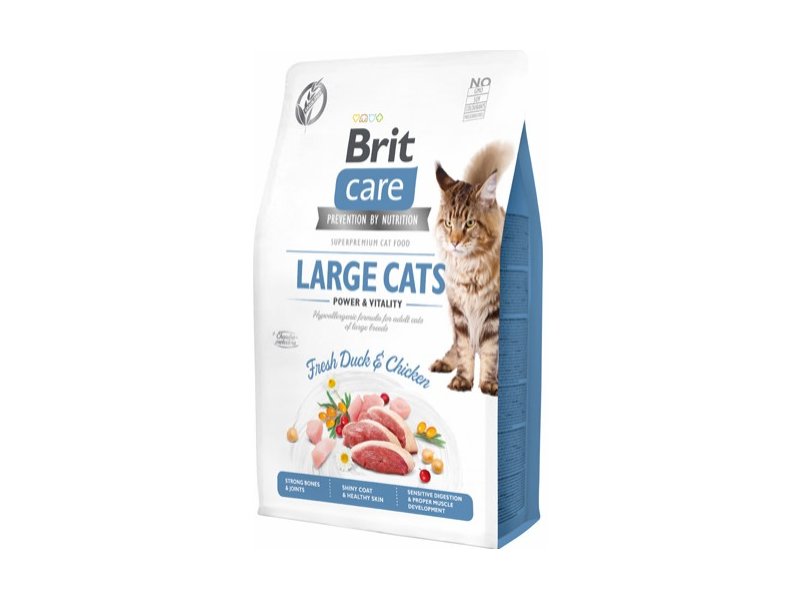 Brit Care Cat Grain-Free Large Cats Power Vitality kassitoit suurt tõugu täiskasvanud kassidele värske pardi- ja kanalihaga.Värsket liha ja rikkalikult olulisi toitaineid sisaldav kergesti seeditav teraviljavaba koostis rahuldab suurte kasside energiavajadusi. Probiootikumid ja prebiootikumid soodustavad tervislike soolebakterite kasvu ja reguleerivad ainevahetusprotsesse. Lahustuvad ja lahustumatud kiudained aitavad säilitada optimaalset kehakaalu.
