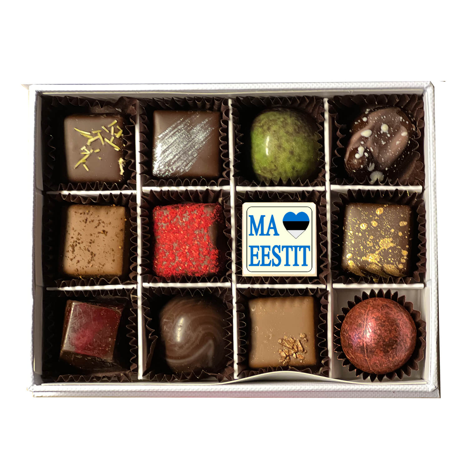 Elegantne käsitööšokolaadide kollektsioon, mille karpi kaunistab Konrad Mägi maal „Ma armastan Eestit!“. Karp sisaldab 16 erineva maitsega šokolaadikommiga assortiid, kus kohtuvad marjad, pähklid, karamell ja muud hoolikalt valitud koostisosad. Iga komm on Chocolala meistrite käsitöö, mis pakub nii maitset kui ka visuaalset naudingut – kunst ja šokolaad ühes kingituses.