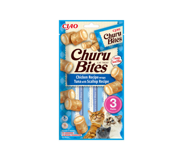 Churu Bites naturaalsed kana, tuunikala ja kammkarbiga maiused kassile. Churu Bites – pehme padjakujuline naturaalne kanalihast, tuunikalast ja kammkarbist maius kassile rohelise tee ekstrakti ja E-vitamiiniga. Valmistatud 100% puhtast ja naturaalsest farmis kasvatatud kanast ja looduslikust tuunikalast. Sees kreemjas Churu® täidis, väljast pehme küpsetatud kanapasta. Ei sisalda teravilju, säilitusaineid ega kunstlikke värvaineid. Iga pakend sisaldab kolme üksikut pakki, et säilitada maksimaalne värskus. 2 erinevat tekstuuri ühe hammustusega. Koostis