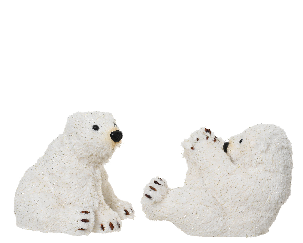 Valge jääkaru dekoratsioon lisab interjööri talvist hubasust ja mängulisust. Pehme karvkattega kujuke on saadaval kahes erinevas asendis – üks istuvas, teine selili lamavas, mängulises poosis. Kuldsed läiked toovad esile kerge sära, muutes kaunistuse visuaalselt silmapaistvaks. Sobib suurepäraselt kasutamiseks aknalaual, riiulil või osana jõuluteemalisest dekoreeringust.