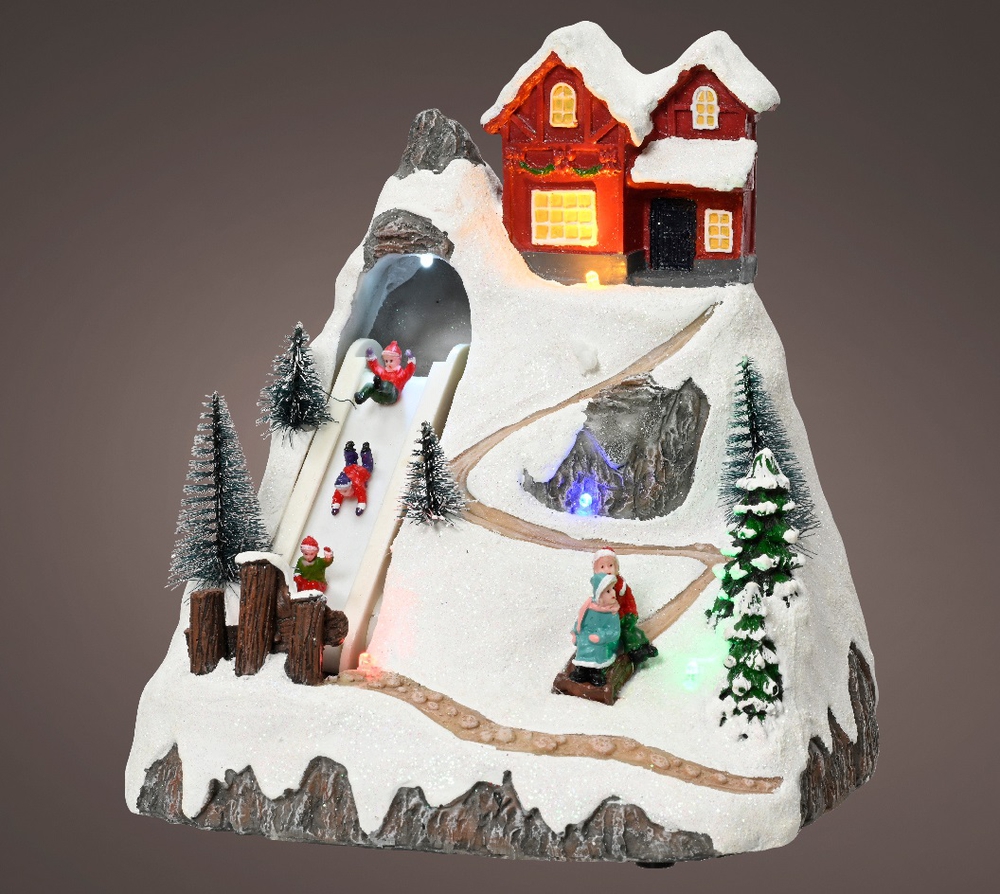 Polüresiinist valmistatud detailne jõuluküla, mis kujutab lumist mäge ja rõõmsalt kelgutavaid lapsi. Majake, kuused ja liuväli on viimistletud käsitsi ning valgustatud 5 värvilise LED-tulediga, mis loovad hubase ja piduliku meeleolu.