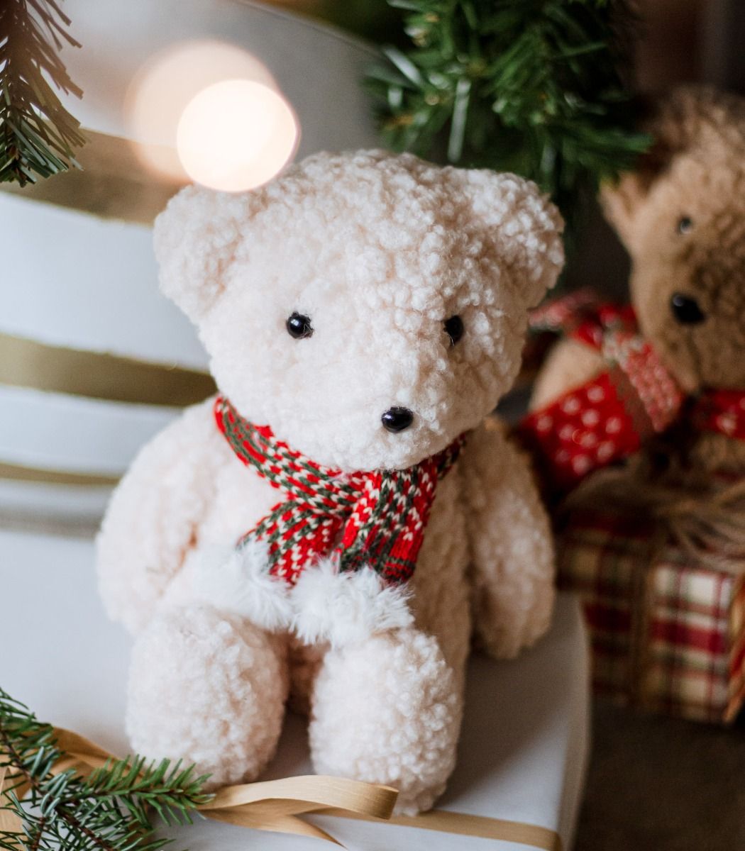 Pehmest fliiskangast valmistatud helepruun karu, millel on kaelas punase ja beeži mustriga sall. Sobib sisustuselemendiks riiulile, aknalauale või hooajaliseks kaunistuseks.