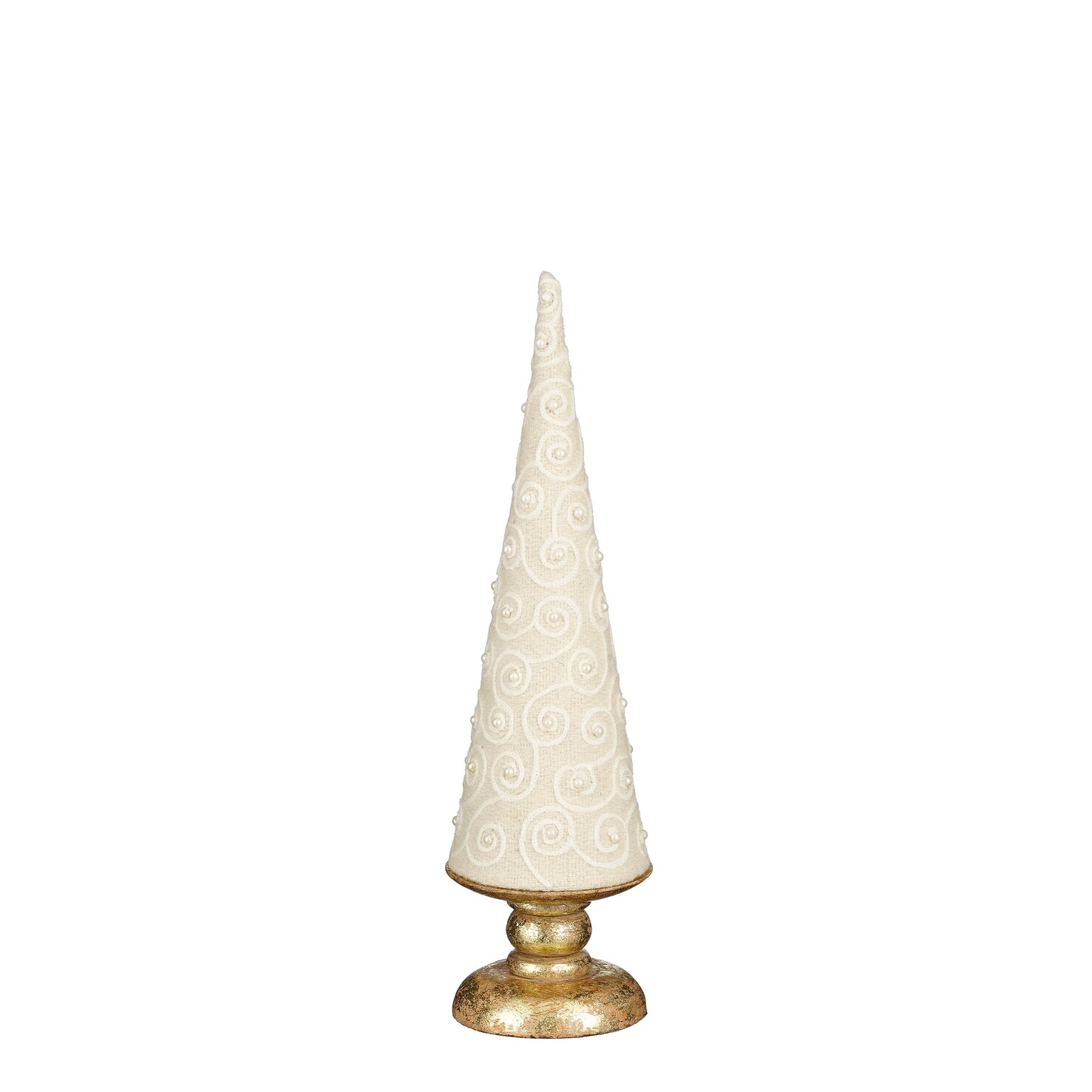 Dekoratiivkuusk, mis seisab elegantsel kuldsel jalal ja on kaetud valge kangaga kaunite spiraalornamentidega. Toob interjööri talvist helgust ja peenet stiili. Sobib hästi nii üksiku aksendina kui ka teiste jõulukaunistuste keskel.