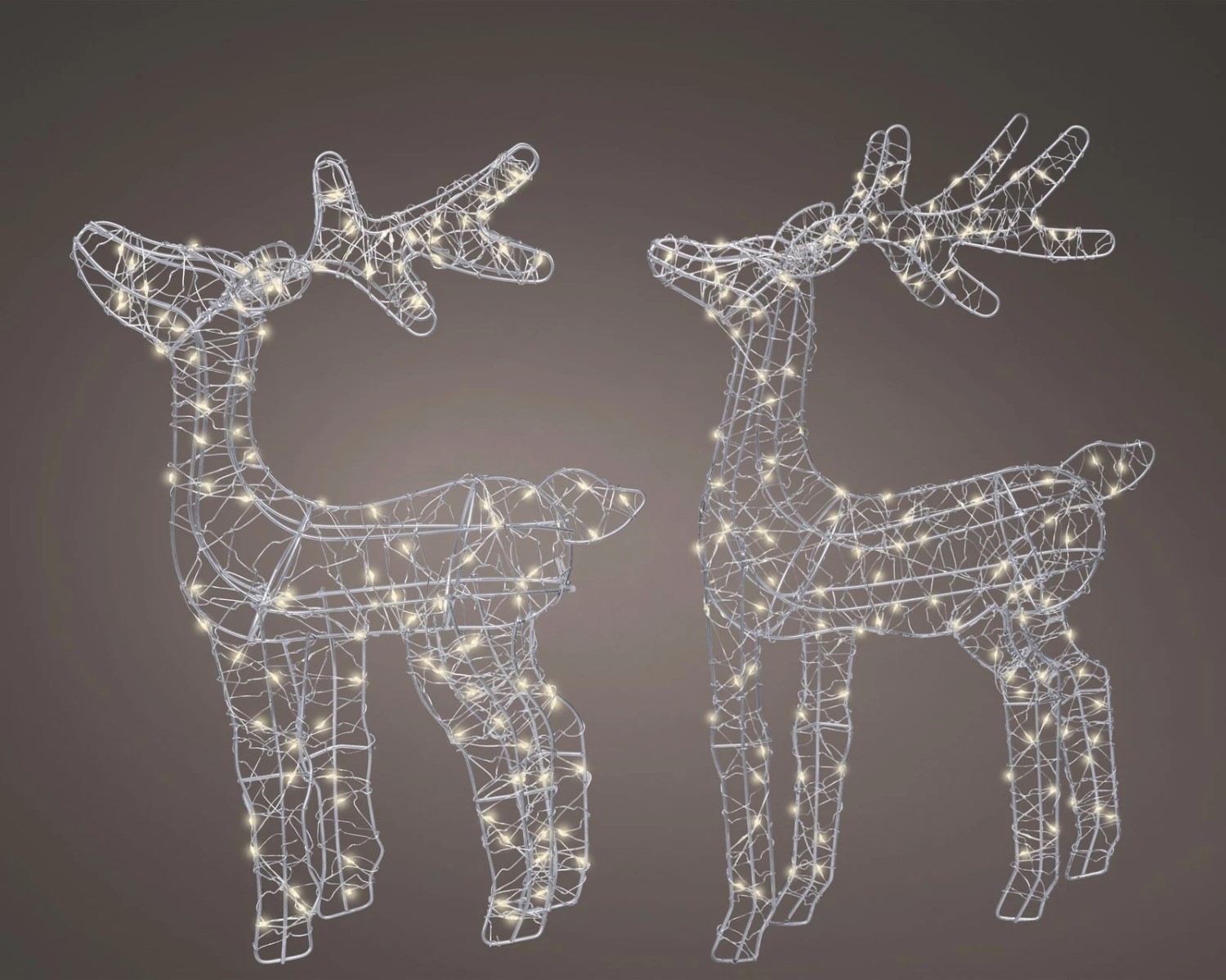 Valgustatud põhjapõdrad loovad õue või siseruumi tõeliselt maagilise meeleolu. Komplektis on kaks metallraamil põhjapõtra, millel kokku 260 sooja valget LED-tuld. Kaunis dekoratsioon sobib ideaalselt talviseks aia-, terrassi- või jõulukaunistuseks ning töötab mugavalt patareidega.