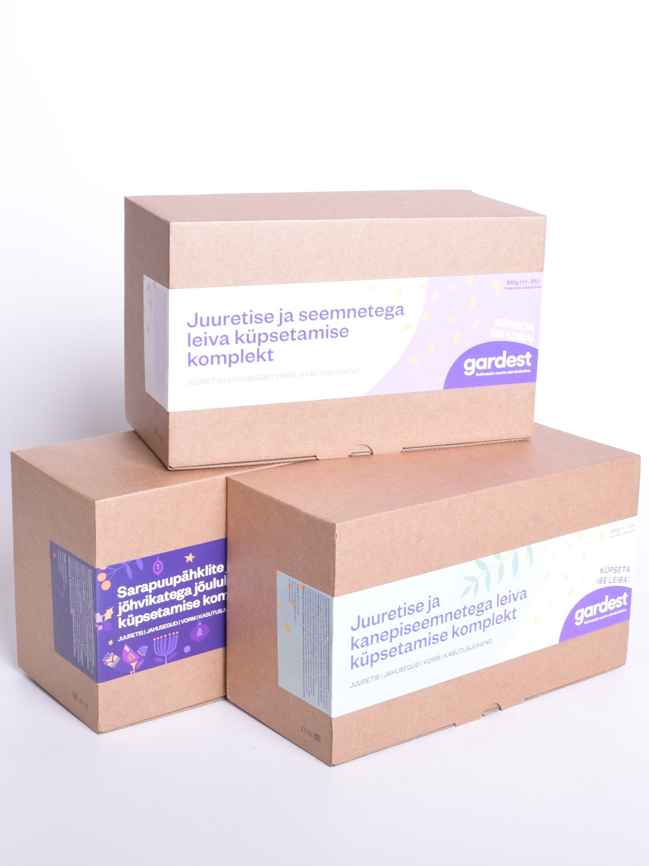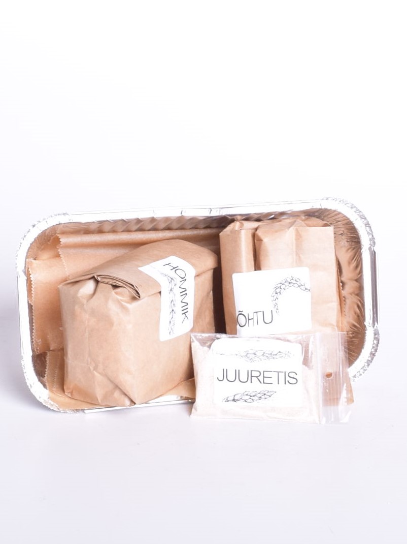 Sarapuupähklite ja jõhvikatega jõululeiva küpsetamise komplekt, mis sisaldab kõike vajalikku, et valmistada kodus ise pidulik jõululeib – juuretis, jahusegud (sh jahud, sool, suhkur) ja isegi küpsetusvorm.
