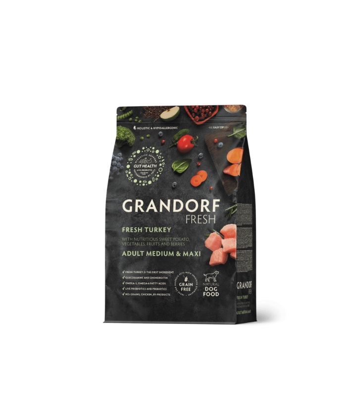 Grandorf Fresh toitudes ei kasutata teravilja, maisi, peeti, subprodukte, kanaliha, kana rasva, soja, kunstlikke maitse- ja lõhnaaineid, GMO-d.