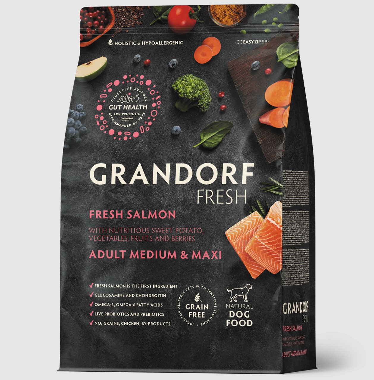 Grandorf Fresh toitudes ei kasutata teravilja, maisi, peeti, subprodukte, kanaliha, kana rasva, soja, kunstlikke maitse- ja lõhnaaineid, GMO-d.