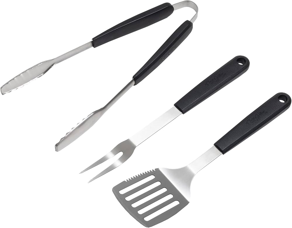 Char-Griller® 3-osaline grillitarvikute komplekt on ideaalne kaaslane igale grillijale. Komplekt sisaldab spaatlit, tangisid ja kahvlit – kõik tööriistad on valmistatud vastupidavast roostevabast terasest ning varustatud mugavate soft-touch käepidemetega kindlaks haardeks.