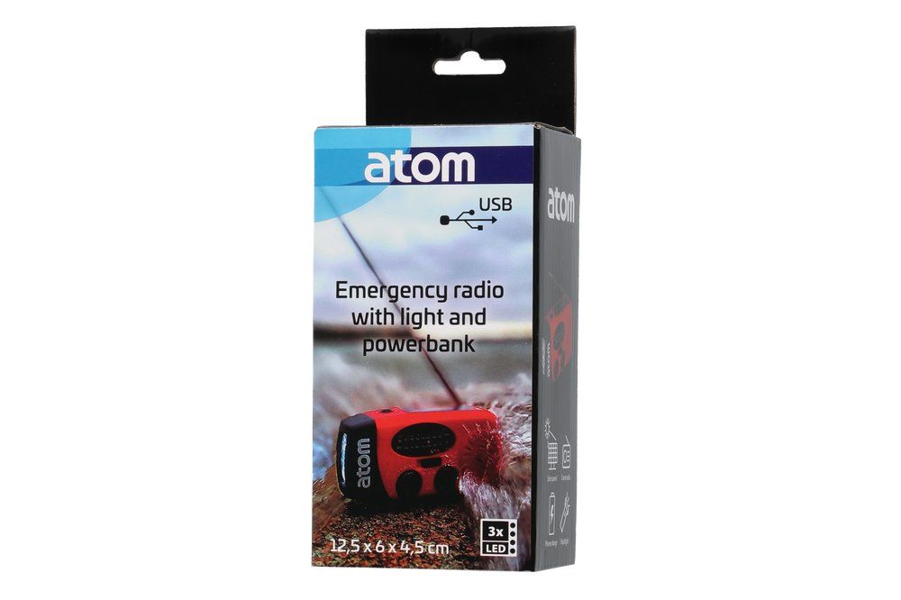 Atom hädaabi raadio on mitmeotstarbeline seade, mis pakub kindlustunnet olukordades, kus elektrit pole käepärast. Seade ühendab endas FM/AM raadio, ereda LED-taskulambi ja akupanga funktsiooni. Toidet saab mitmel viisil: käsivändaga, päikesepaneeli abil või USB-kaabli kaudu. See võimaldab hoida seadet töökorras nii kodus, reisil, suvilas kui ka hädaolukordades. Sisseehitatud aku võimaldab vajadusel laadida ka mobiiltelefoni. Seade on pritsmekindel ning varustatud häiresignaaliga, mis lisab turvalisust ootamatutes olukordades.
