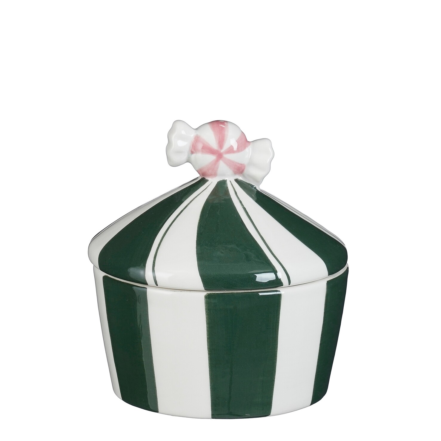 Mängulise disainiga hoiupurk, mis toob ruumi magusa ja lõbusa jõulumeeleolu. Tumeroheline ja valge triibuline korpus loob klassikalise maiustusekarbi ilme, mida täiendab kaanel olev roosa-valge kommimotiiv. Sobib suurepäraselt maiustuste, küpsiste või väiksemate esemete hoiustamiseks ning on ühtlasi dekoratiivne detail köögis või elutoas.