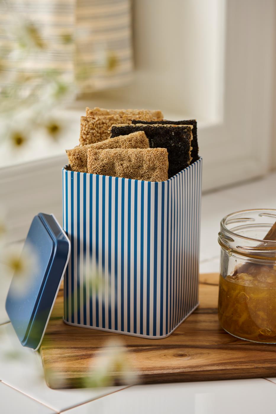 Dekoratiivne ja praktiline metallpurk sobib suurepäraselt küpsiste, kommide, pähklite või teiste väiksemate esemete hoiustamiseks. Sinise kaane ja triibulise disainiga purk lisab kööki või sahvrisse värskust ja stiili.