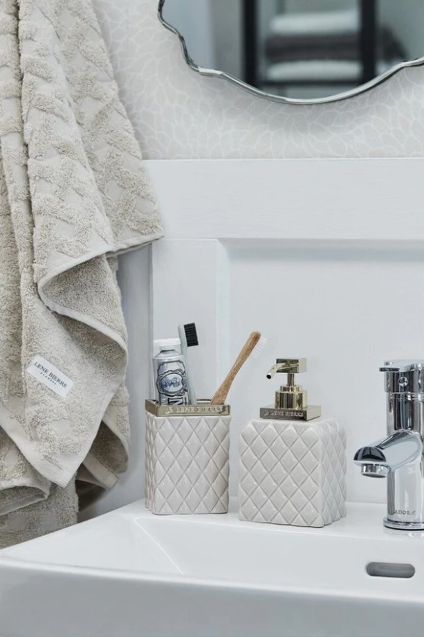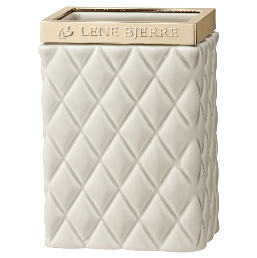Elegantne hoiutops eksklusiivse kuldse servaga, firmalt Lene Bjerre. Stiilne Portia hambatops on valmistatud keraamikast. Voolujoonelise ja elegantse disainiga hambakruus sobib hõlpsasti iga sisekujundusega.
