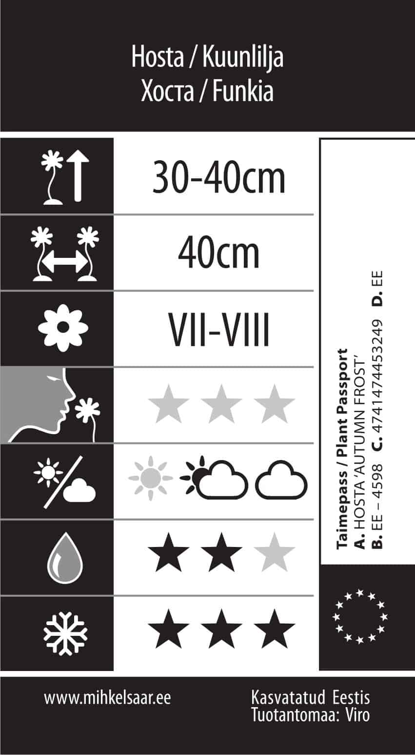 Hosta ‘Autumn Frost’ on silmapaistev keskmise kasvuga sort, mille sinakasrohelised lehed on laia helekollase servaga, mis suve jooksul muutub kreemikaks. Taim moodustab kompaktse ja korrapärase puhmiku, sobides hästi varjulistesse peenardesse või suurtesse anumatesse. Juulis ilmuvad lavendlilillad kellukjad õied, mis tõusevad lehestiku kohale ja toovad peenrasse lisailu. Tegu on keskmise suurusega hostaga, mis aastatega arendab tiheda ja dekoratiivse puhmiku.