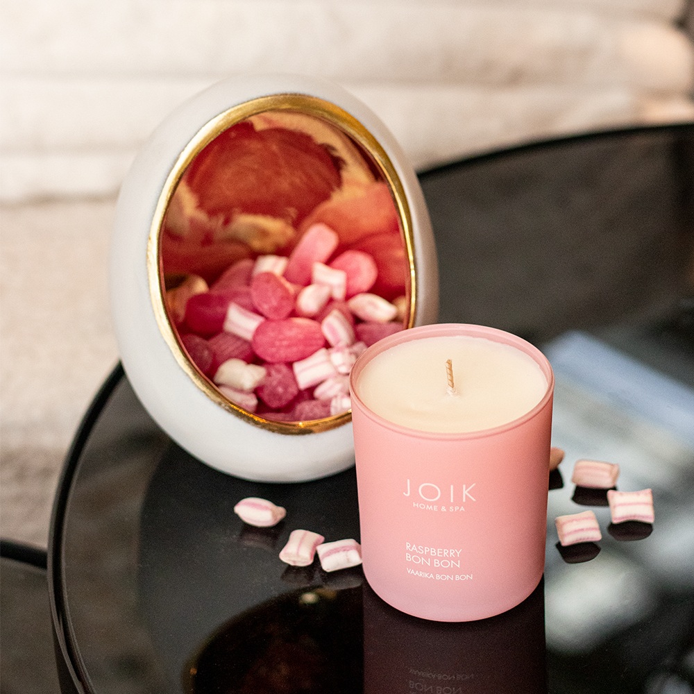 “Raspberry Bon Bon” on magus ja meeldivalt kihiline lõhnaküünal, mille aroomikompositsioon ühendab karamelli ja vanilje siidise pehmuse, hurmava vaarika, eksootilised õied ja kreemise kookospiima. Lõhn mõjub romantiliselt ja armsalt, lisades ruumi pehmust ja naiselikku iseloomu.