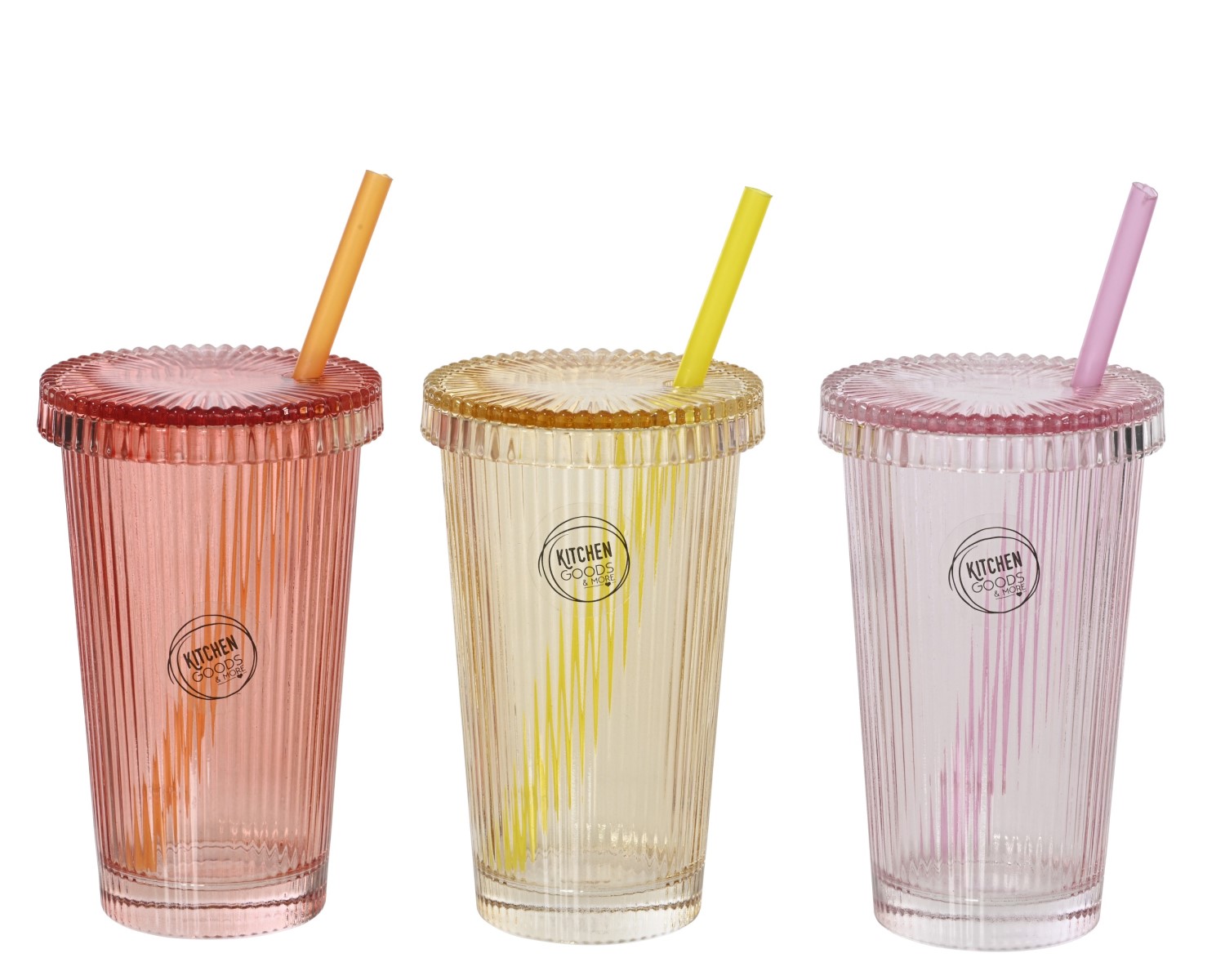 Mugavaks igapäevaseks kasutamiseks mõeldud klaasist joogitops on varustatud praktilise kaane ja korduvaustatava kõrrega. Reljeefne pind ning värviline detail annavad anumale mängulise ilme, sobides suurepäraselt nii kodusesse kasutusse kui ka suviste värskendavate jookide serveerimiseks.