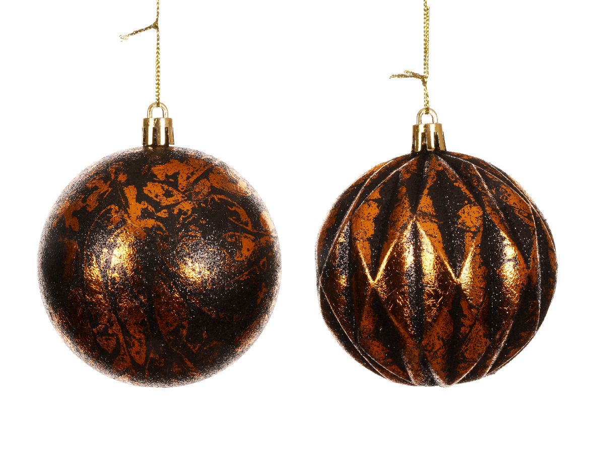 Stiilne must jõulukuul on kaunistatud vasekarva mustriga, mis loob pilkupüüdva ja elegantse kontrasti. Metallik-läikega muster lisab sügavust ja luksuslikku sära, muutes selle ideaalseks aksessuaariks modernsesse või glamuursema stiiliga jõulupuusse.