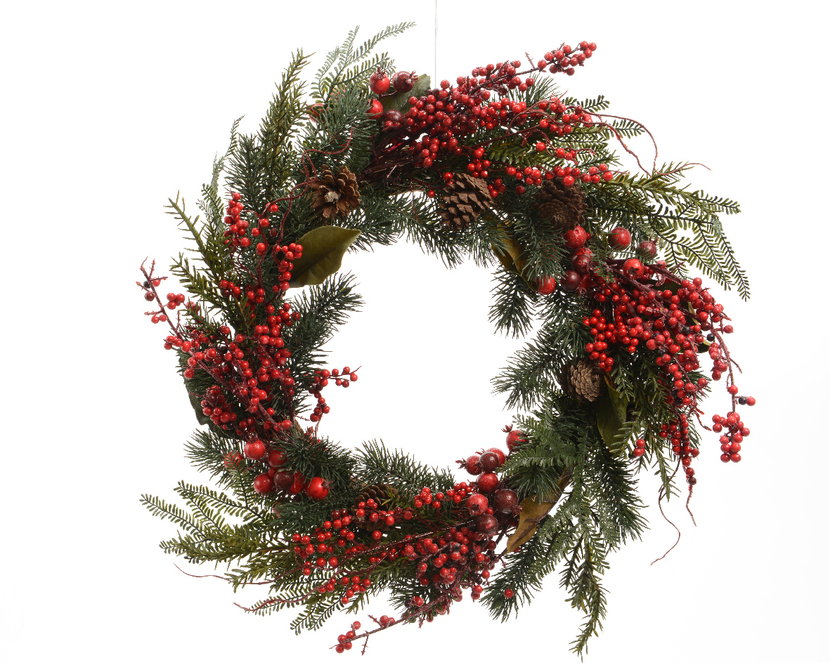 Kunstmaterjalist punaste marjade ja pruunide käbidega jõulupärg.