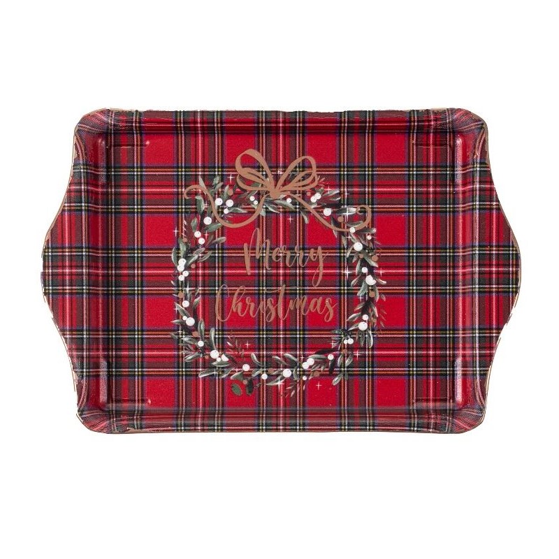 Metallist kandik “Merry Christmas” on kaunis ja praktiline lisand pühadelauale. Punase ruudulise mustri ja pärjakujundusega kandik loob rõõmsa jõulutunde ning sobib ideaalselt maiuste, suupistete või kuumade jookide serveerimiseks. Kompaktne suurus teeb selle mugavaks nii igapäevaseks kasutamiseks kui ka jõuluseks dekoratsiooniks.