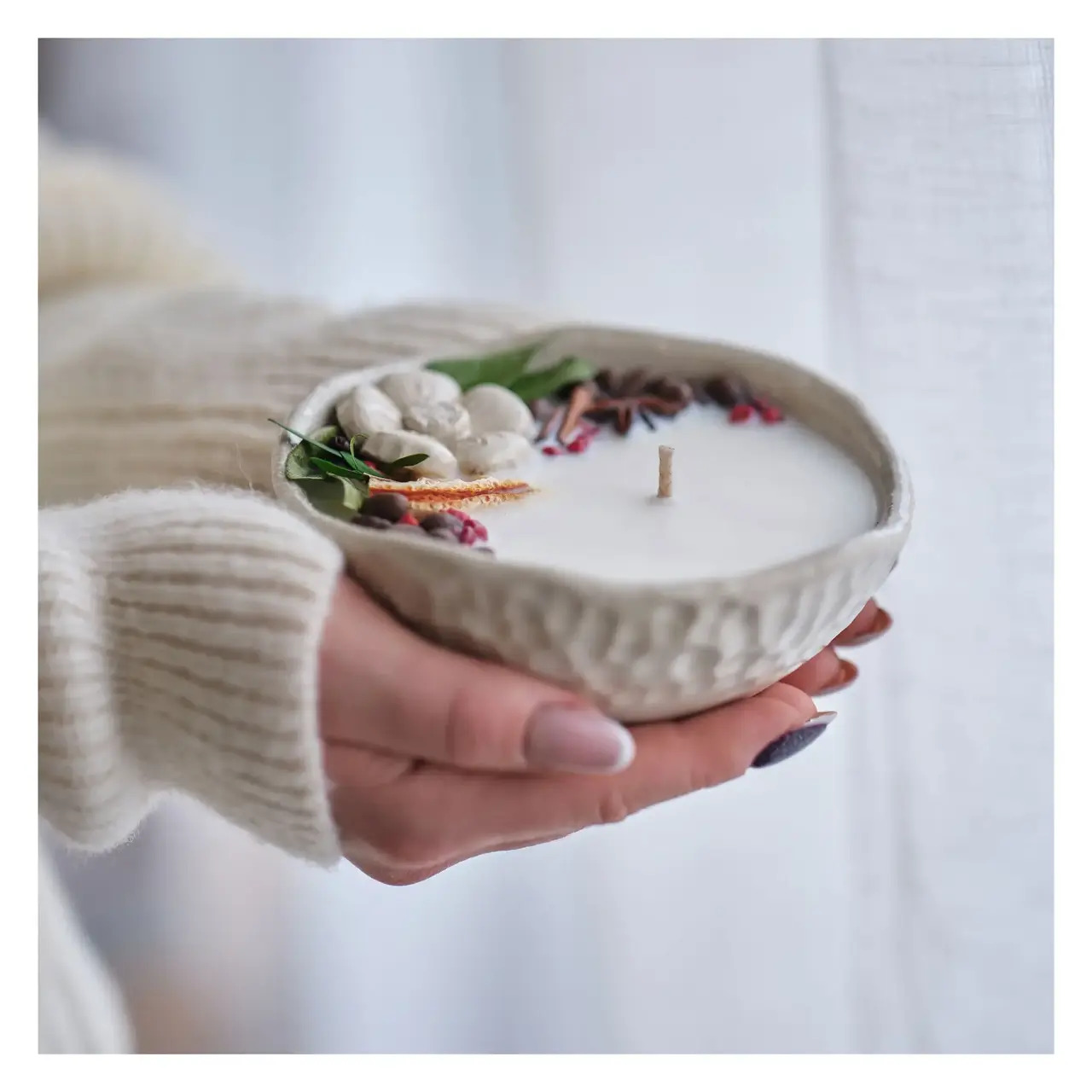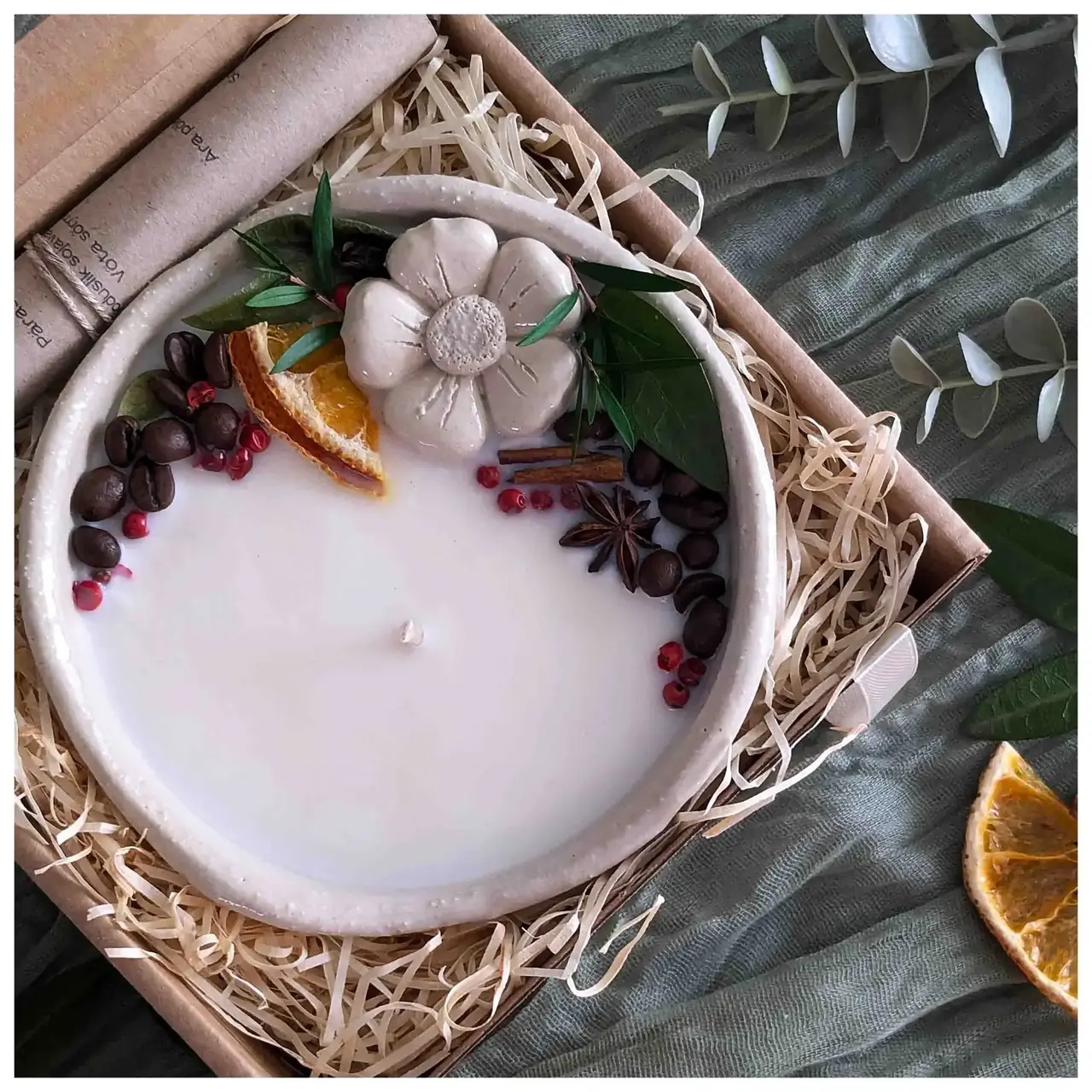 Käsitööna valminud sojavahaküünal “Jõuluootus” on loodud tooma koju soojust ja hubasust. Küünal on valatud meie keraamikastuudios valmistatud keraamilisse kaussi, millest saab pärast küünla lõpuni põlemist kaunis ja praktiline sisustuselement. Küünal on pealt kaunistatud looduslike detailidega – mandariiniviilu, kaneeli, tähtaniisi, kohviubade, stabiliseeritud eukalüpti, kuivatatud lehtede, roosa pipra ja marjadega. Kaunistused võivad olla käsitööle omaselt veidi erinevad.