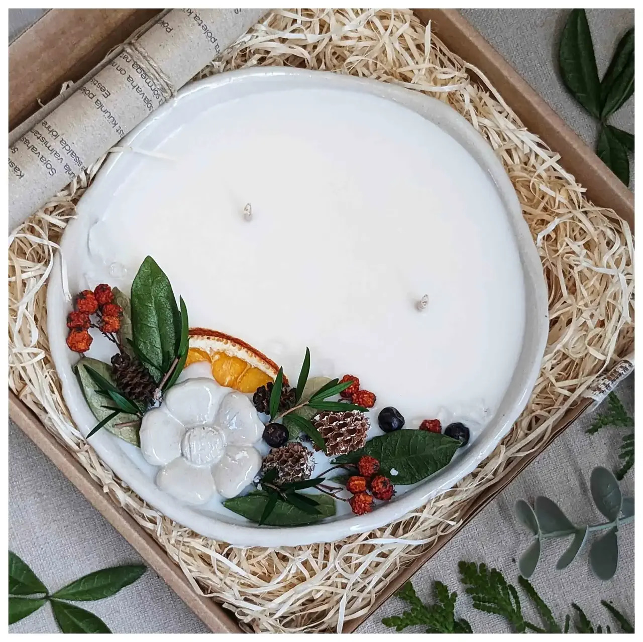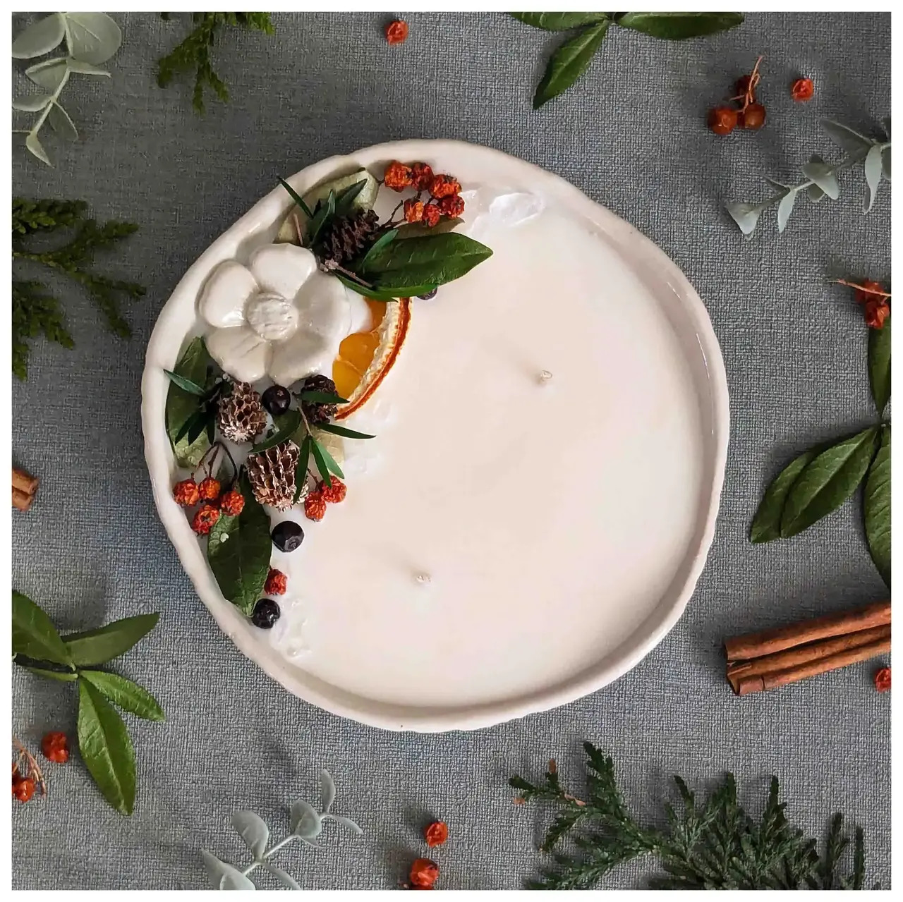 Kreemikatooniline keraamiline kauss on valminud käsitööna keraamikastuudios, kus iga ese on hoolikalt kujundatud ja viimistletud. Pärast küünla põlemist saab kaussi kasutada dekoratiivse või praktilise anumana. Küünla pind on kaunistatud looduslike elementidega – mandariiniviilu, pihlakaid, käbisid, kadakamarju, stabiliseeritud eukalüptioksi ja kuivatatud lehti –, mis toovad ruumi talvist ilu. Käsitööle omaselt võib iga küünla kaunistus veidi varieeruda.