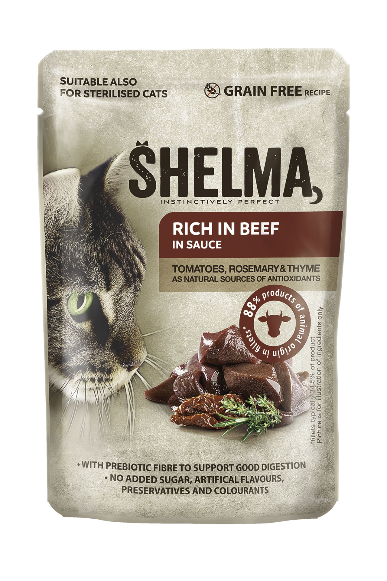 – Kõrge toiteväärtus — varustab kassi organismi toitainetega, mida ta vajab, et olla tugev ja terve. – Suur niiskusesisaldus — aitab suurendada kassi veetarbimist, mis on oluline neerufunktsioonide säilitamiseks ja dehüdratsiooni vältimiseks. – Tauriin tagab südame, silmade ja aju õige funktsioneerimise. – Madal kalorite sisaldus — sobib suurepäraselt ka kassidele, kellel on kaaluga probleeme. – Iga pakend sisaldab nelja üksikut pakki, et säilitada maksimaalne värskus.