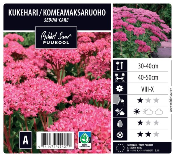 Kukehari ‘Carl’ on tugev ja püstise kasvukujuga püsik, millel on paksud sinakasrohelised lehed ja tugevad varred. Suve lõpus ilmuvad roosad õisikud, mis meelitavad mesilasi ja liblikaid. Taim talub hästi põuda ja kasvab hästi kuival, päikesepaistelisel kasvukohal. Sobib peenrasse, looduslikku istutusse või kuivemasse aianurka, kus on vaja vastupidavat ja kauakestvat õitsejat.