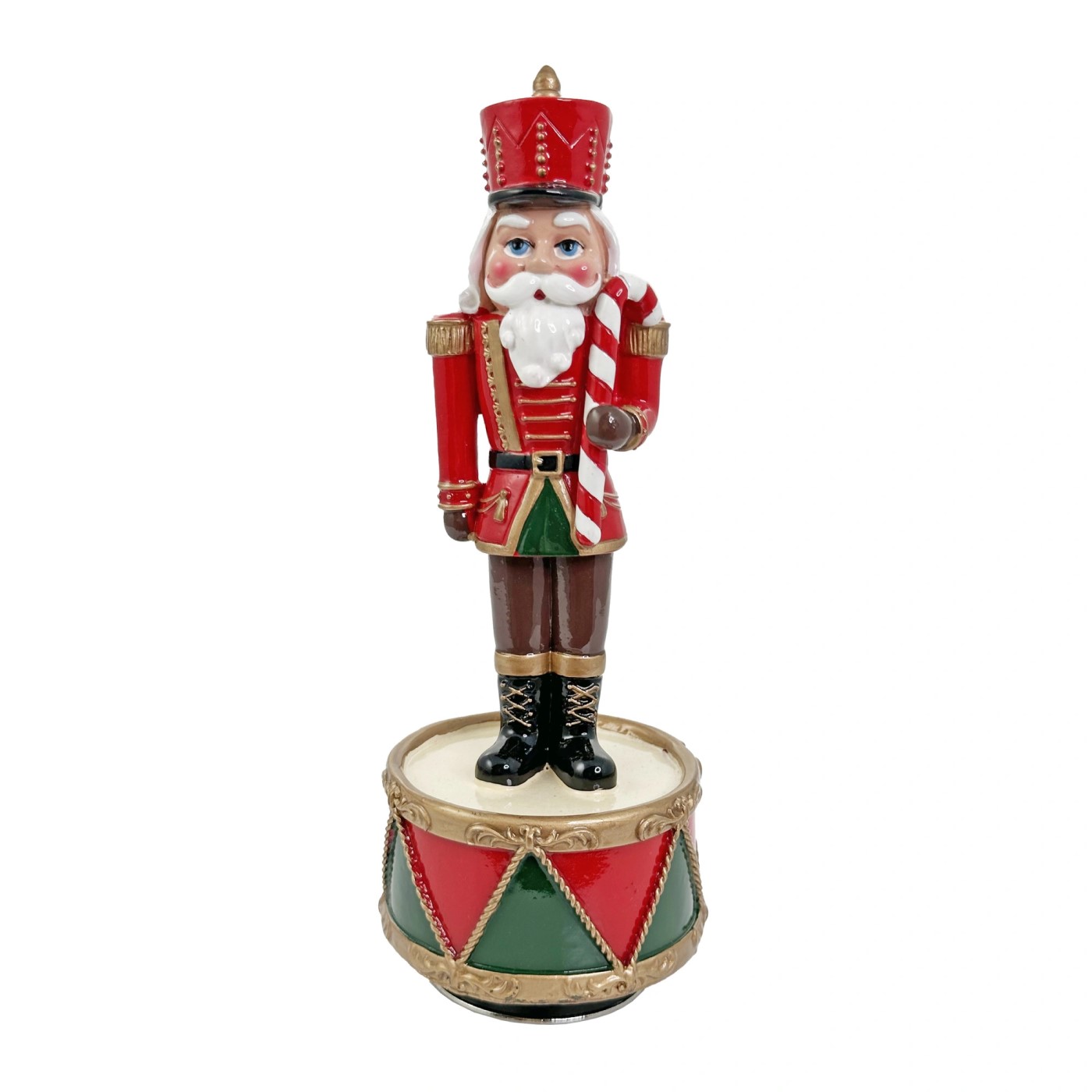 Sammu jõulumuinasjuttu selle pilkupüüdva pähklipureja-kujulise muusikakastiga! Klassikalises punarohelises värvigammas kujundatud figuur seisab trummil ja hoiab käes suurt kommikeppi. Detailirohke kujundus ja helilõik loovad koju nostalgilise pühadetunde.