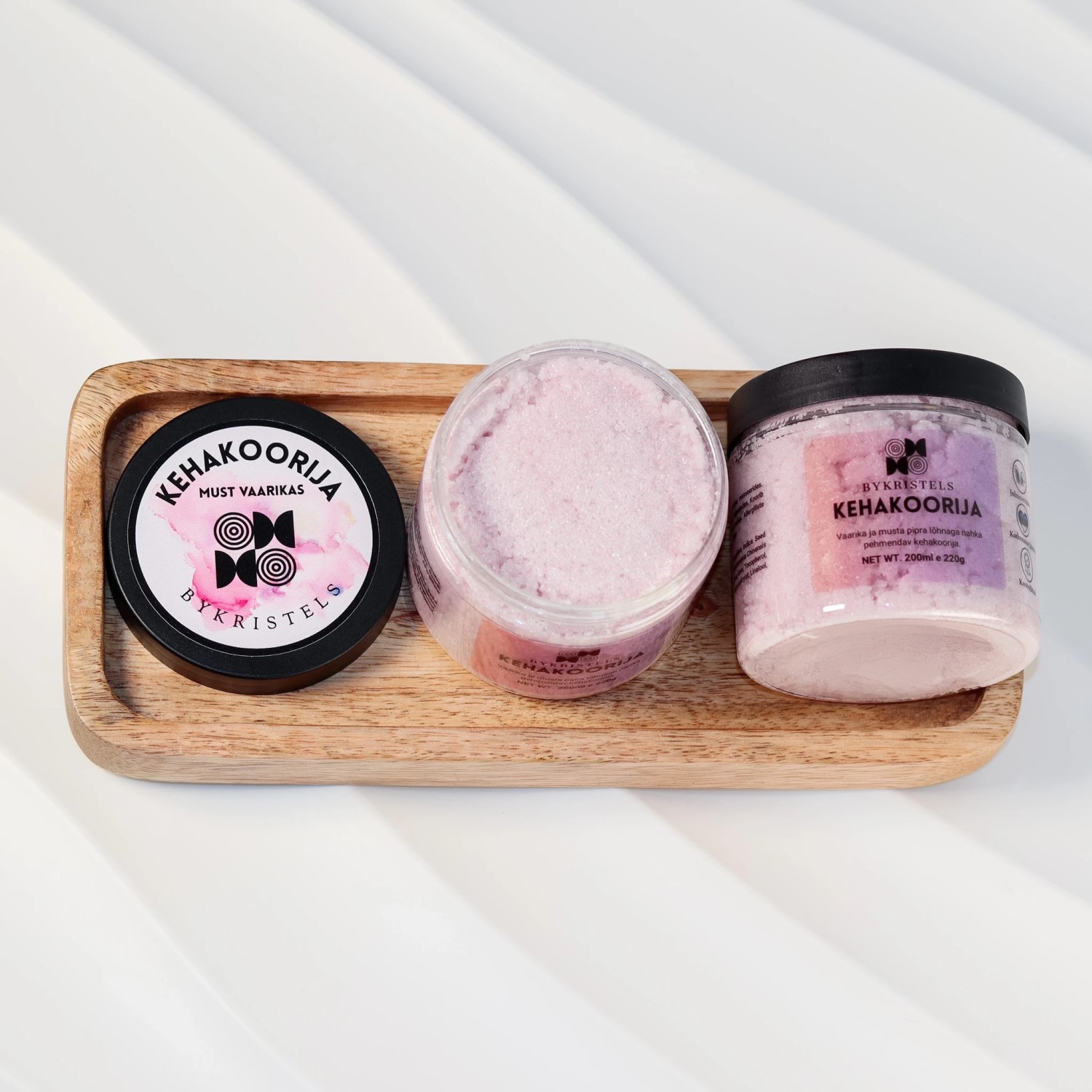 Kehakoorija Must vaarikas on suhkruga kehahooldustoode, mis eemaldab õrnalt surnud naharakud ning jätab naha pehmeks ja siledaks. Vaarika ja musta pipra kooslus annab koorijale kergelt magusa, samas veidi vürtsika aroomi.