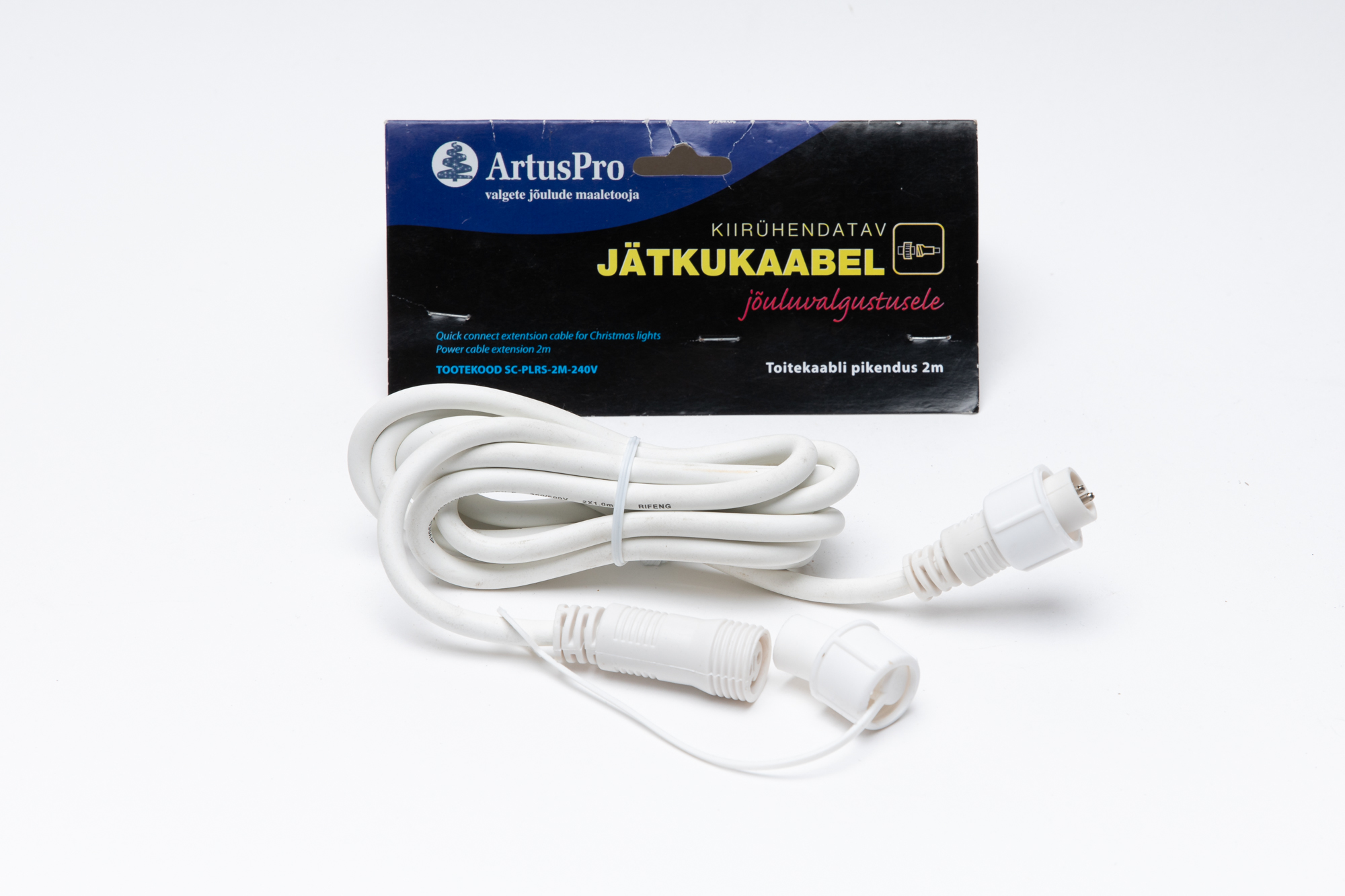 2-meetri pikkune kiirühendusega toitejuhtme pikenduskaabel, mida kasutatakse valgusketi ja toitejuhtme vahelise vahemaa suurendamiseks. Valge kaabel sobib visuaalselt heledate fassaadide ja valgete valgusketi süsteemidega. Ühildub ArtusPro jätkatavate jõuluvalgustitega ning sobib kasutamiseks nii sise- kui välitingimustes.