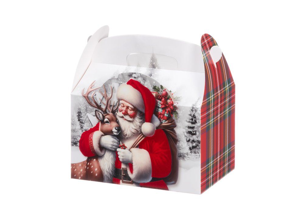 Kinkekarp jõuluvanaga on piduliku kujundusega kinkepakend, mis loob kingituste andmisele tõelise jõulumeeleolu. Karbi ühel küljel on kaunis pilt jõuluvanast ja põhjapõdrast talvises külas, teisel küljel klassikaline punane ruuduline muster. CMYK-trükk koos mati laminaadiga annab karbile kvaliteetse ja vastupidava viimistluse. Kerge ja praktiline sangadega konstruktsioon muudab karbi mugavaks kaasas kandmiseks.
