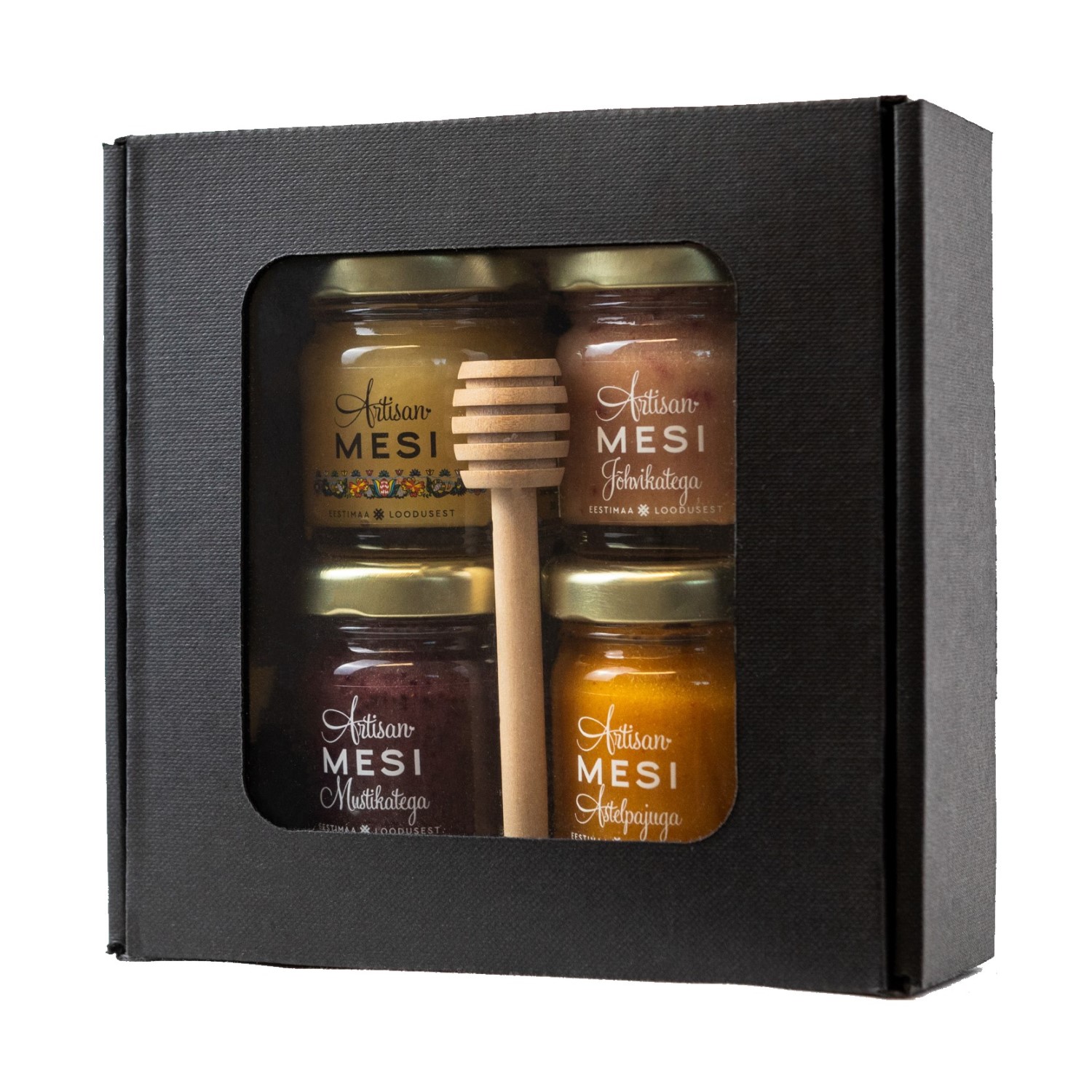 Gurmee ja kingiideed Kinkekomplekt Artisan Honey 4x50g ja meevurr kinkekarbis