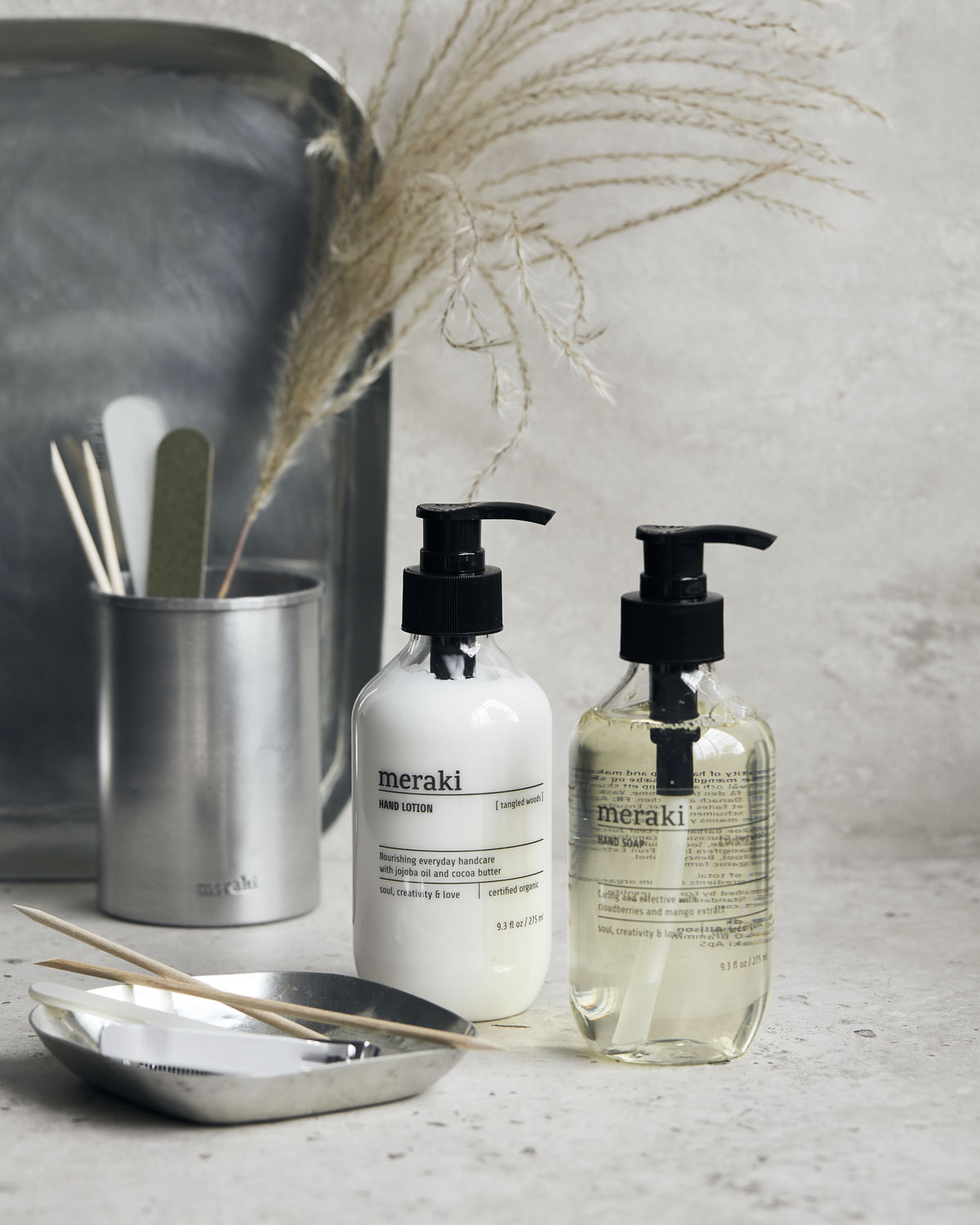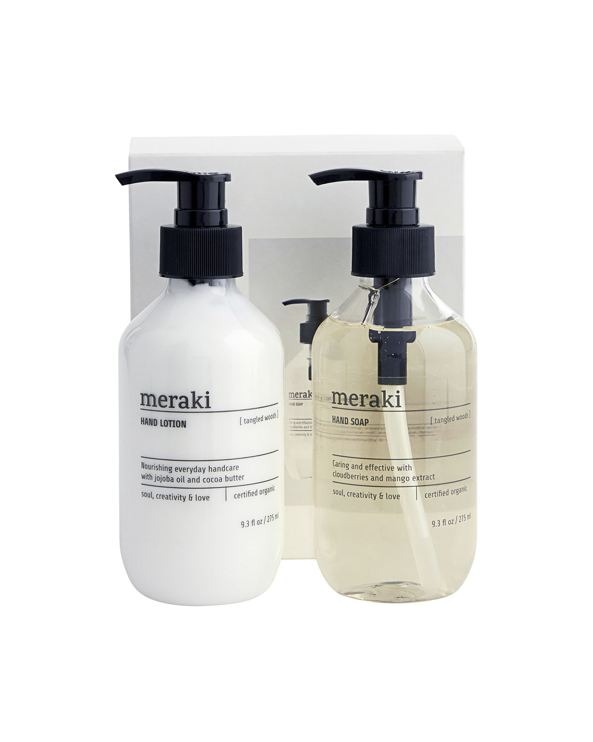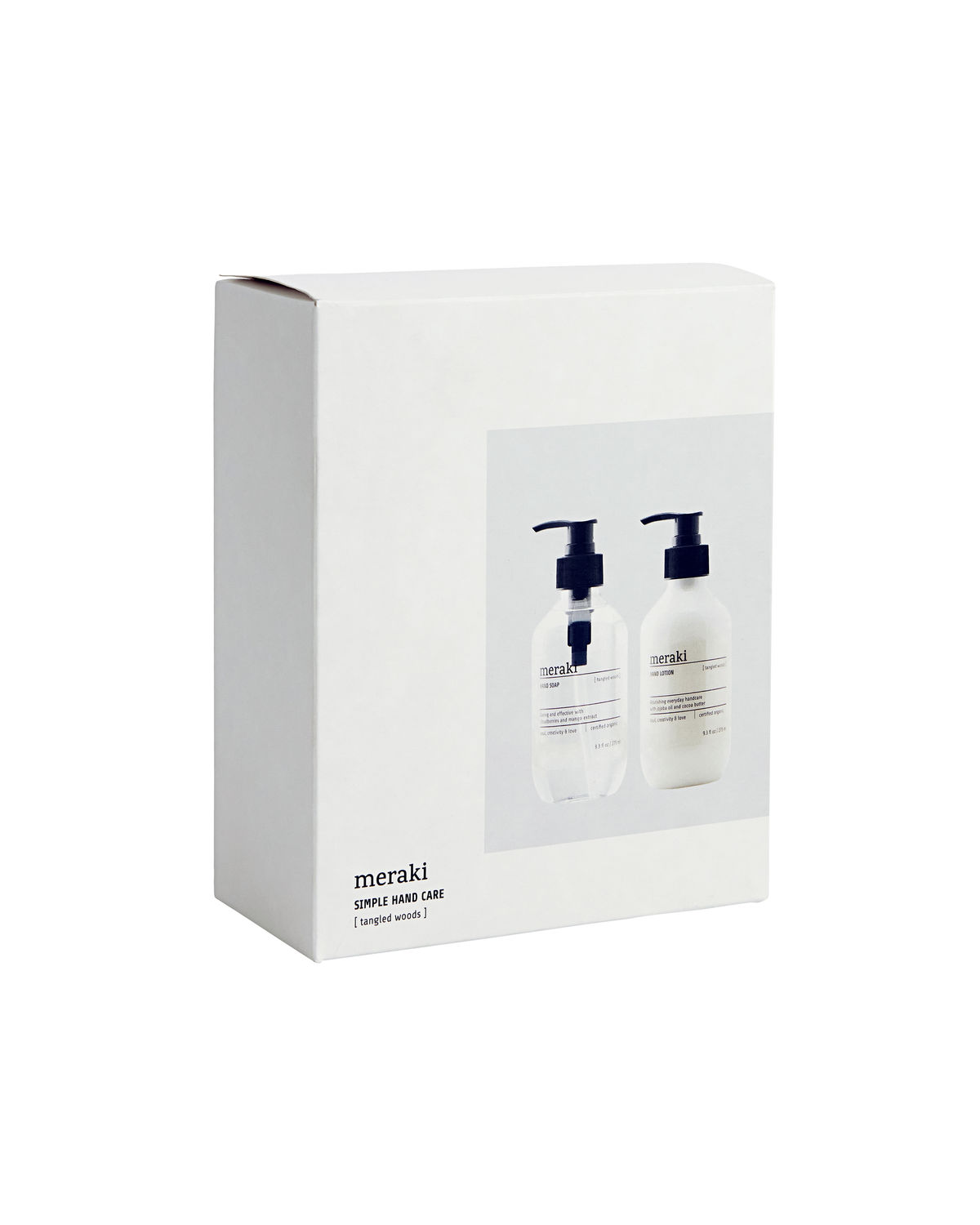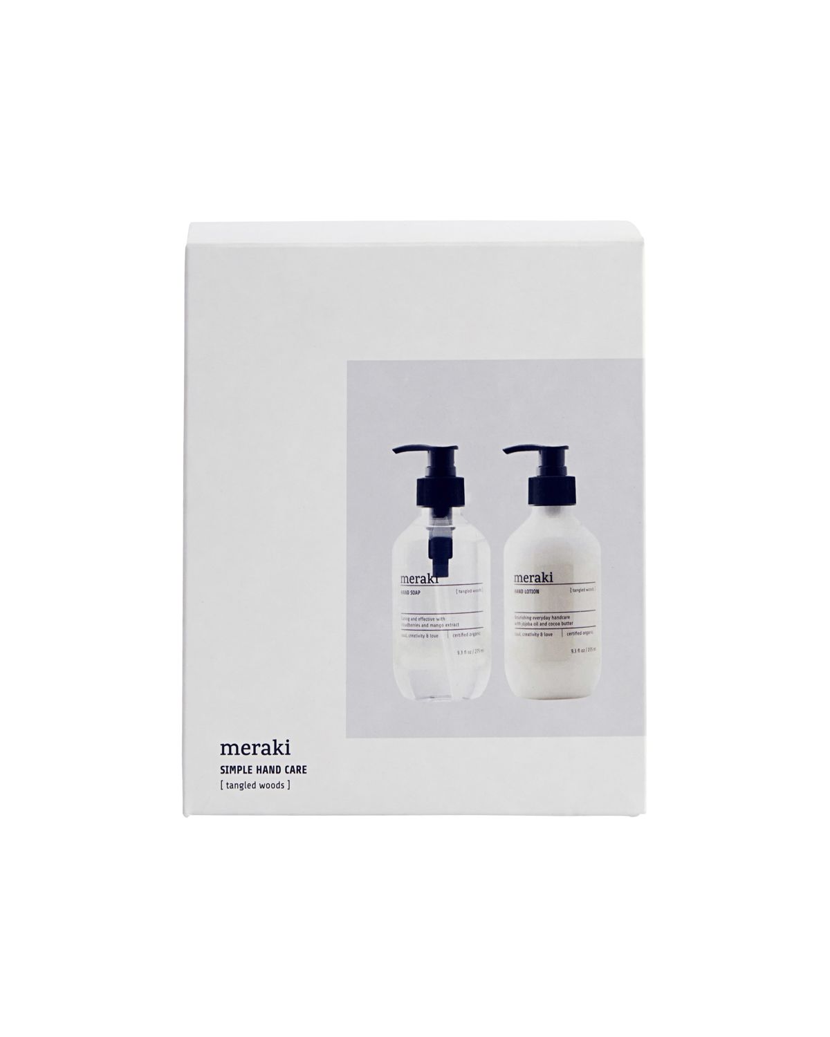 Meraki kinkekarp hoolitseb teie igapäevaste kätehooldusvajaduste eest käteseebi ja kätekreemiga. Mõlemad on sertifitseeritud orgaanilised ja neil on Tangled Woodsi lõhn tähtaniisi, piparmündi, patšuli ja puidu nootidega.