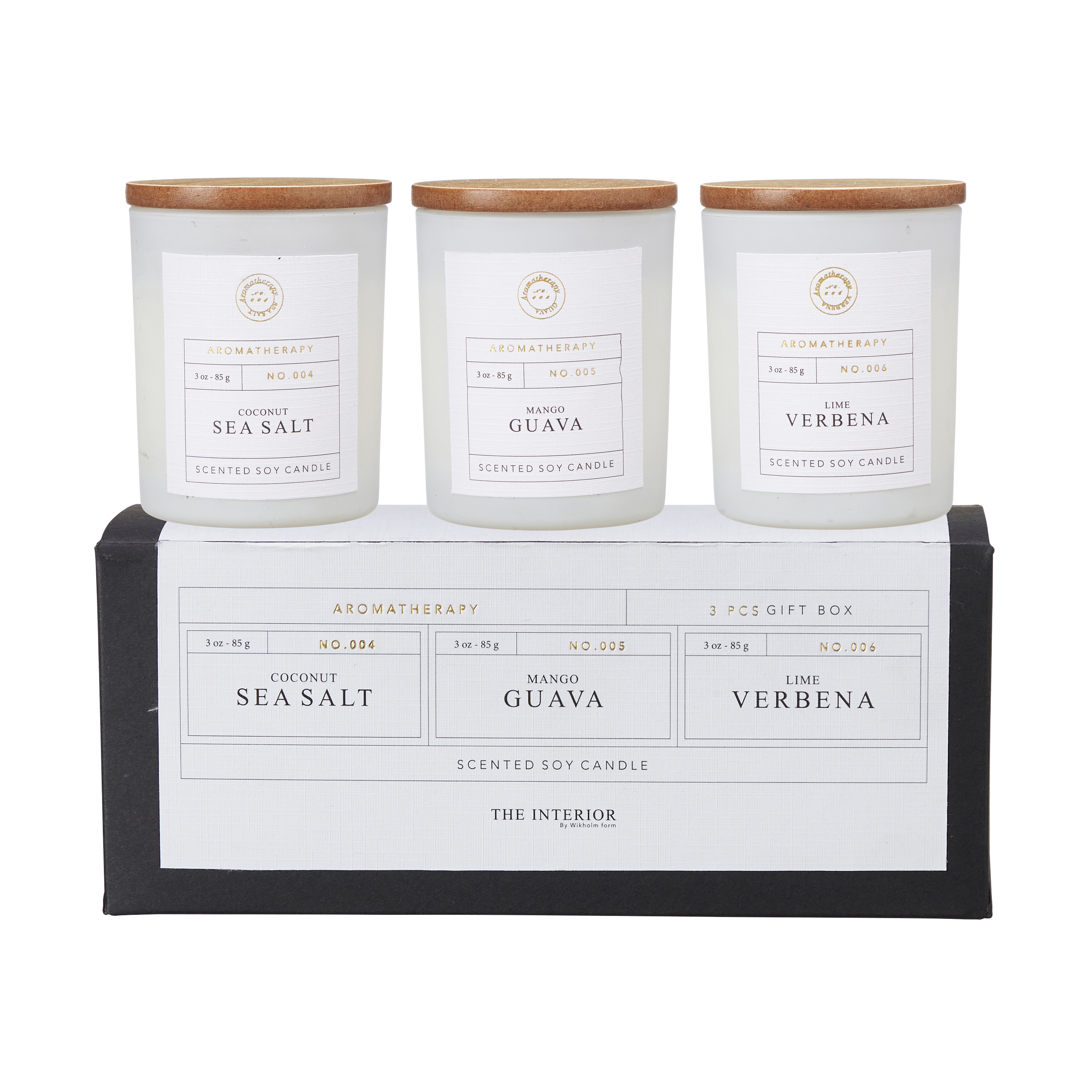 Komplekt koosneb kolmest lõhnaküünlast – kookos ja meresool 85g – mango ja guajaav 85g – laim ja raudürt 85g