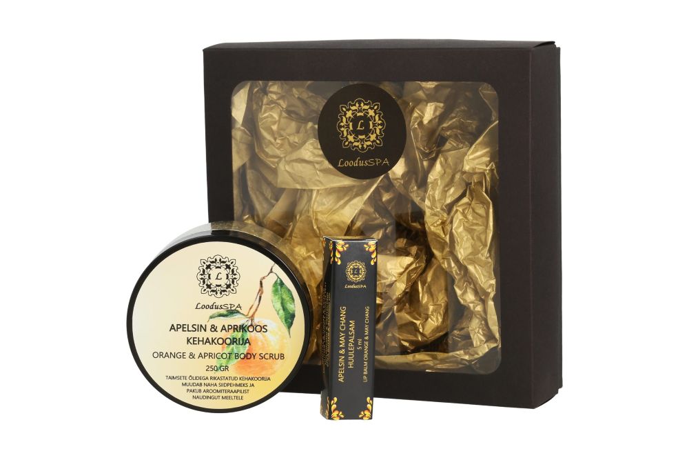 Kehahooldus Kinkekomplekt LoodusSpa kehakoorija “Apelsin ja Aprikoos” ja Huulepalsam